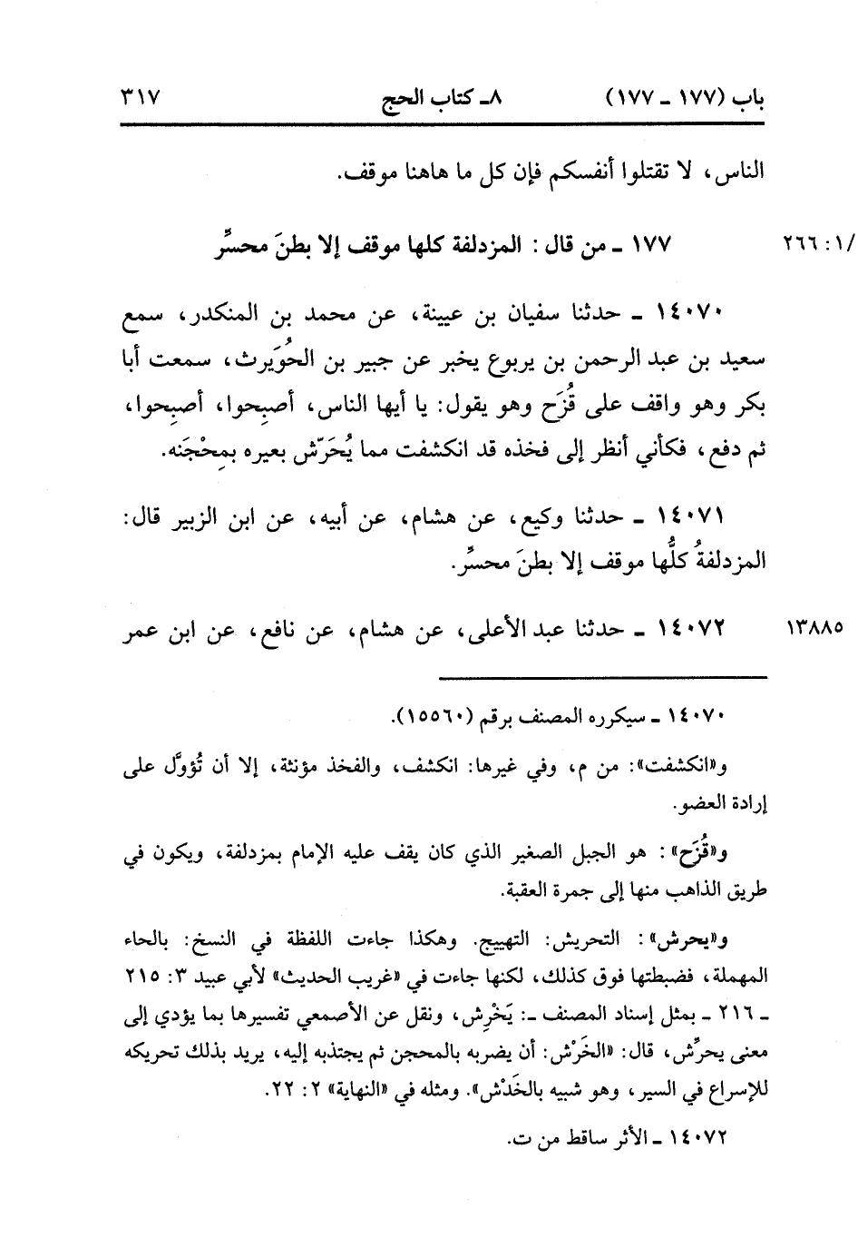 177- مَنْ قَالَ الْمُزْدَلِفَةُ كُلُّهَا مَوْقِفٌ ، إِلاَّ بَطْنَ مُحَسِّرٍ.