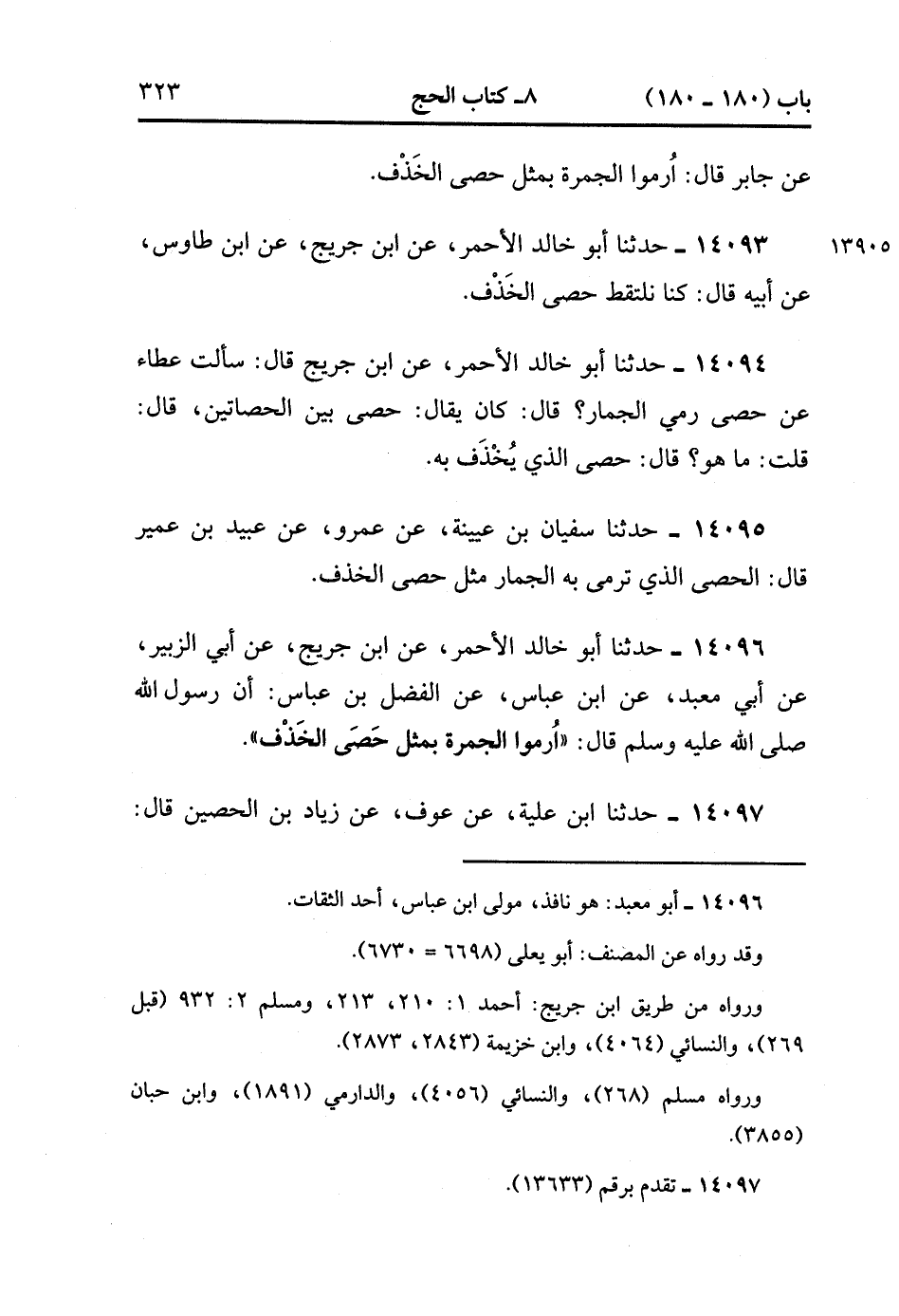 14096- حدَّثَنَا أَبُو خَالِدٍ الأَحْمَرِِ ، عَنِ ابْنِ جُرَيْجٍ ، عَنْ أَبِي الزُّبَيْرِ ، عَنْ أَبِي مَعْبَدٍ ، عَنِ ابْنِ عَبَّاسٍ ، عَنِ الْفَضْلِ بْنِ عَبَّاسٍ ؛ أَنَّ رَسُولَ اللهِ صَلَّى الله عَلَيْهِ وَسَلَّمَ ، قَالَ : ارْمُوا الْجَمْرَةَ بِمِثْلِ حَصَى الْخَذْفِ.