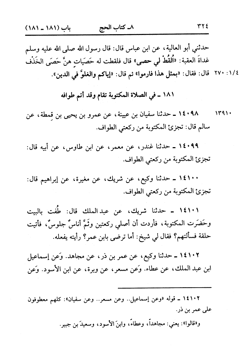 14102- حدَّثَنَا وَكِيعٌ ، عَنْ عُمَرَ بْنِ ذَرٍّ ، عَنْ مُجَاهِدٍ (ح) وَعَنْ إسْمَاعِيلَ بْنِ عبْدِ الْمَلِكِ ، عَنْ عَطَاءٍ (ح) وَعَنْ مِسْعَرٍ ، عَنْ وَبَرَةَ ، عَنِ ابْنِ الأَسْوَدِ (ح) وَعَنْ سُفْيَانَ ، عَنْ رَجُلٍ ، عَنْ سَعِيدِ بْنِ جُبَيْرٍ ؛ قَالُوا : تُجْزِئُ الْمَكْتُوبَةُ مِنْ رَكْعَتَيِ الطَّوَافِ. (4/270:1).