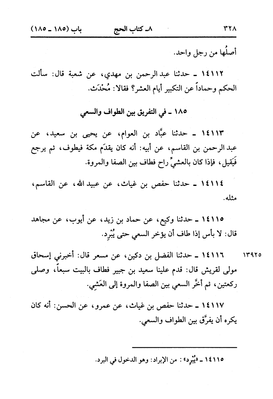 14117- حدَّثَنَا حَفْصُ بْنُ غِيَاثٍ ، عَنْ عَمْرٍو ، عَنِ الْحَسَنِ ؛ أَنَّهُ كَانَ يَكْرَهُ أَنْ يُفَرِّقَ بَيْنَ الطَّوَافِ وَالسَّعْيِ. (4/272:1).
