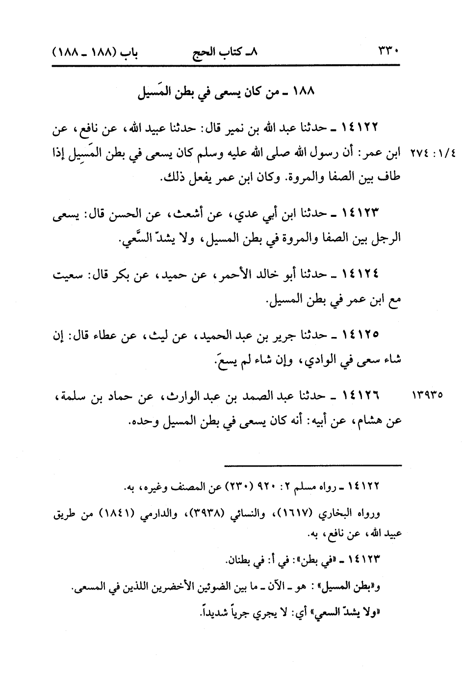 14126- حدَّثَنَا عَبْدُ الصَّمَدِ بْنُ عَبْدِ الْوَارِثِ ، عَنْ حَمَّادِ بْنِ سَلَمَةَ ، عَنْ هِشَامٍ ، عَنْ أَبِيهِ ؛ أَنَّهُ كَانَ يَسْعَى فِي بَطْنِ الْمَسِيلِ وَحْدَهُ. (4/274:1).