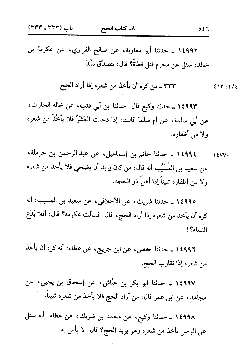 14998- حدَّثَنَا وَكِيعٌ ، عَنْ مُحَمَّدِ بْنِ شَرِيكٍ ، عَنْ عَطَاءٍ ؛ أَنَّهُ سُئِلَ عَنِ الرَّجُلِ يَأْخُذُ مِنْ شَعْرِهِ وَهُوَ يُرِيدُ الْحَجَّ ؟ قَالَ : لاَ بَأْسَ بِهِ. (4/413:1).