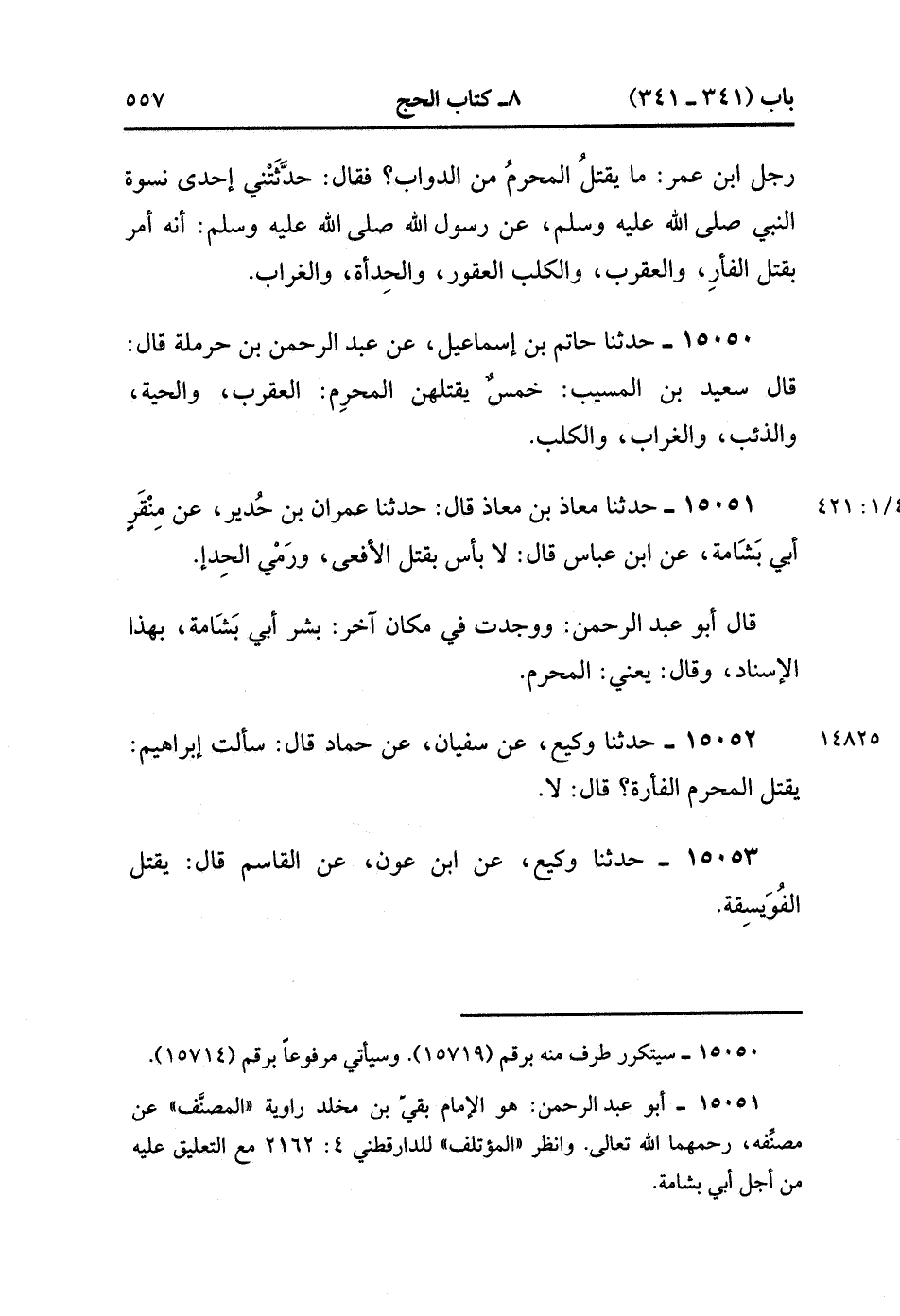15050- حدَّثَنَا حَاتِمُ بْنُ إسْمَاعِيلَ ، عَنْ عَبْدِ الرَّحْمَنِ بْنِ حَرْمَلَةَ ، قَالَ : قَالَ سَعِيدُ بْنُ الْمُسَيَّبِ : خَمْسٌ يَقْتُلُهُنَّ الْمُحْرِمُ ؛ الْعَقْرَبَ ، وَالْحَيَّةَ ، وَالذِّئْبَ ، وَالْغُرَابَ ، وَالْكَلْبَ. (4/420:1)