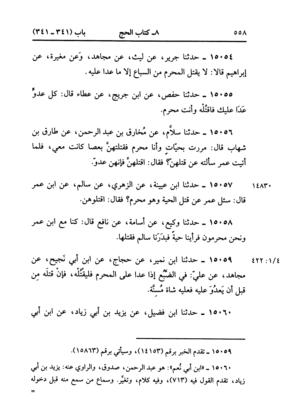 15058- حدَّثَنَا وَكِيعٌ ، عَنْ أُسَامَةَ ، عَنْ نَافِعٍ ، قَالَ : كُنَّا مَعَ ابْنِ عُمَرَ وَنَحْنُ مُحْرِمُونَ فَرَأَيْنَا حَيَّةً ، فَبَدَرَنَا سَالِمٌ فَقَتَلَهَا. (4/421:1)