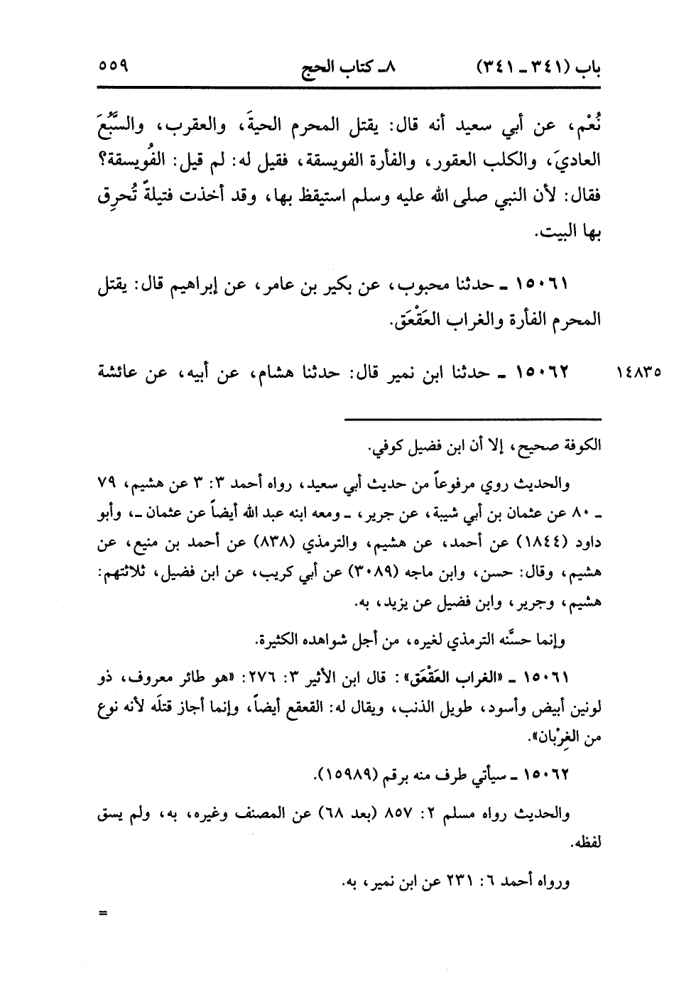 15061- حدَّثَنَا مَحْبُوبٌ ، عَنْ بُكَيْرِ بْنِ عَامِرٍ ، عَنْ إِبْرَاهِيمَ ، قَالَ : يَقْتُلُ الْمُحْرِمُ الْفَأْرَةَ ،وَالْغُرَابَ الْعَقْعَقَ. (4/422:1).