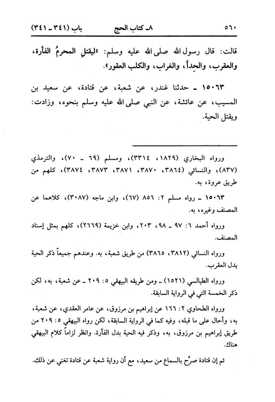 15063- حدَّثَنَا غُنْدَرٌ ، عَنْ شُعْبَةَ ، عَنْ قَتَادَةَ ، عَنْ سَعِيدِ بْنِ الْمُسَيَّبِ ، عَنْ عَائِشَةَ ، عَنِ النَّبِيِّ صَلَّى الله عَلَيْهِ وَسَلَّمَ ؛ بِنَحْوِهِ ، وَزَادَتْ : وَيَقْتُلُ الْحَيَّةَ. (4/422:1).