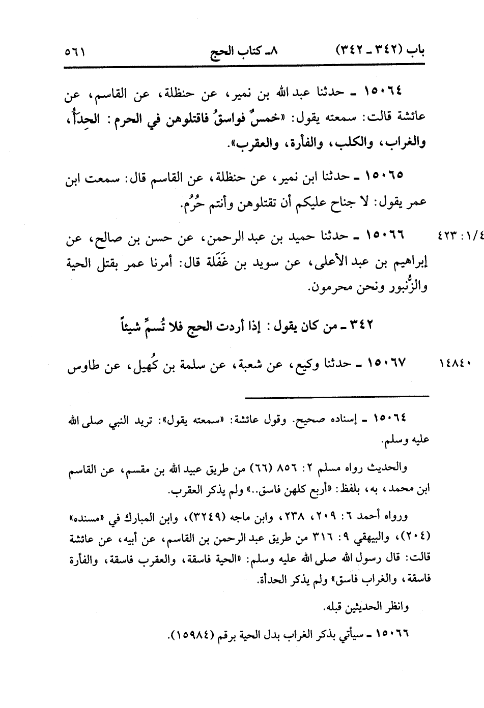 15065- حدَّثَنَا ابْنُ نُمَيْرٍ ، عَنْ حَنْظَلَةَ ، عَنِ الْقَاسِمِ ، قَالَ : سَمِعْتُ ابْنَ عُمَرَ يَقُولُ : لاَ جُنَاحَ عَلَيْكُمْ أَنْ تَقْتُلُوهُنَّ وَأَنْتُمْ حُرُمٌ. (4/422:1)