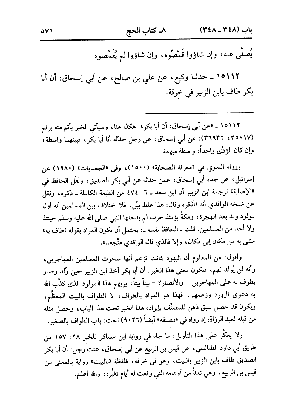 15112- حدَّثَنَا وَكِيعٌ ، عَنْ عَلِيِّ بْنِ صَالِحٍ ، عَنْ أَبِي إِسْحَاقَ ؛ أَنَّ أَبَا بَكْرٍ طَافَ بِابْنِ الزُّبَيْرِ فِي خِرْقَةٍ. (4/429:1).