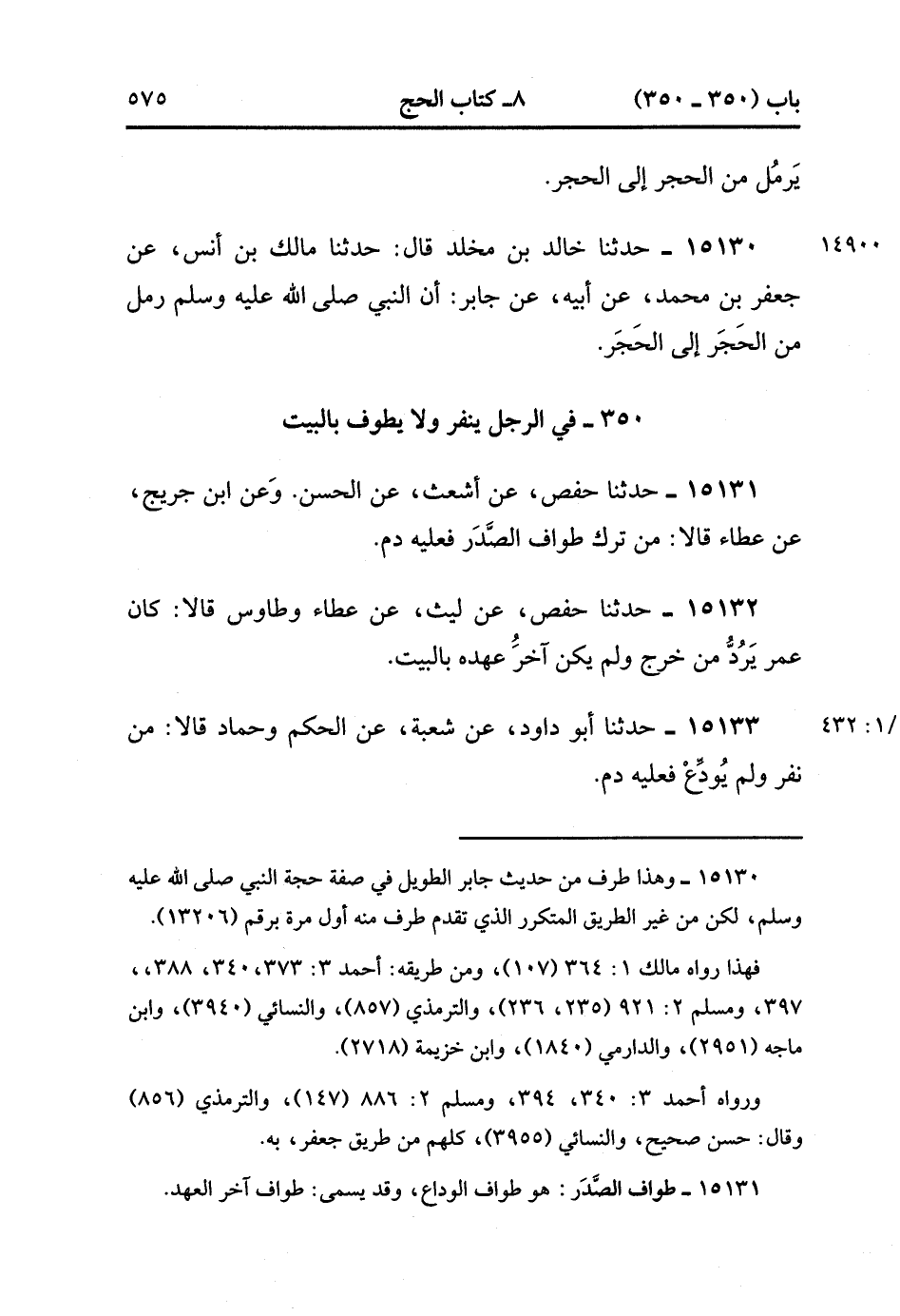 15133- حدَّثَنَا أَبُو دَاوُدَ ، عَنْ شُعْبَةَ ، عَنِ الْحَكَمِ ، وَحَمَّادٍ قَالاَ : مَنْ نَفَرَ وَلَمْ يُوَدِّعْ ، فَعَلَيْهِ دَمٌ. (4/432:1).