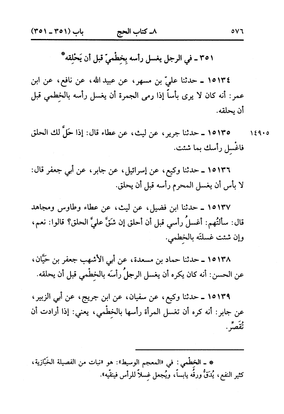 15139- حدَّثَنَا وَكِيعٌ ، عَنْ سُفْيَانَ ، عَنِ ابْنِ جُرَيْجٍ ، عَنْ أَبِي الزُّبَيْرِ ، عَنْ جَابِرٍ ؛ أَنَّهُ كَرِهَ أَنْ تَغْسِلَ الْمَرْأَةُ رَأْسَهَا بِالْخِطْمِيِّ ، يَعْنِي إذَا أَرَادَتْ أَنْ تُقَصِّرَ. (4/432:1).