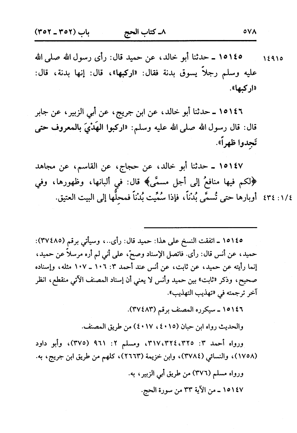 15145- حدَّثَنَا أَبُو خَالِدٍ ، عَنْ حُمَيْدٍ ، عَنْ أَنَسٍ (1)، قَالَ : رَأَى رَسُولُ اللهِ صَلَّى الله عَلَيْهِ وَسَلَّمَ رَجُلاً يَسُوقُ بَدَنَةً ، فَقَالَ : ارْكَبْهَا ، قَالَ : إِنَّهَا بَدَنَةً ، قَالَ : ارْكَبْهَا. (4/433:1)