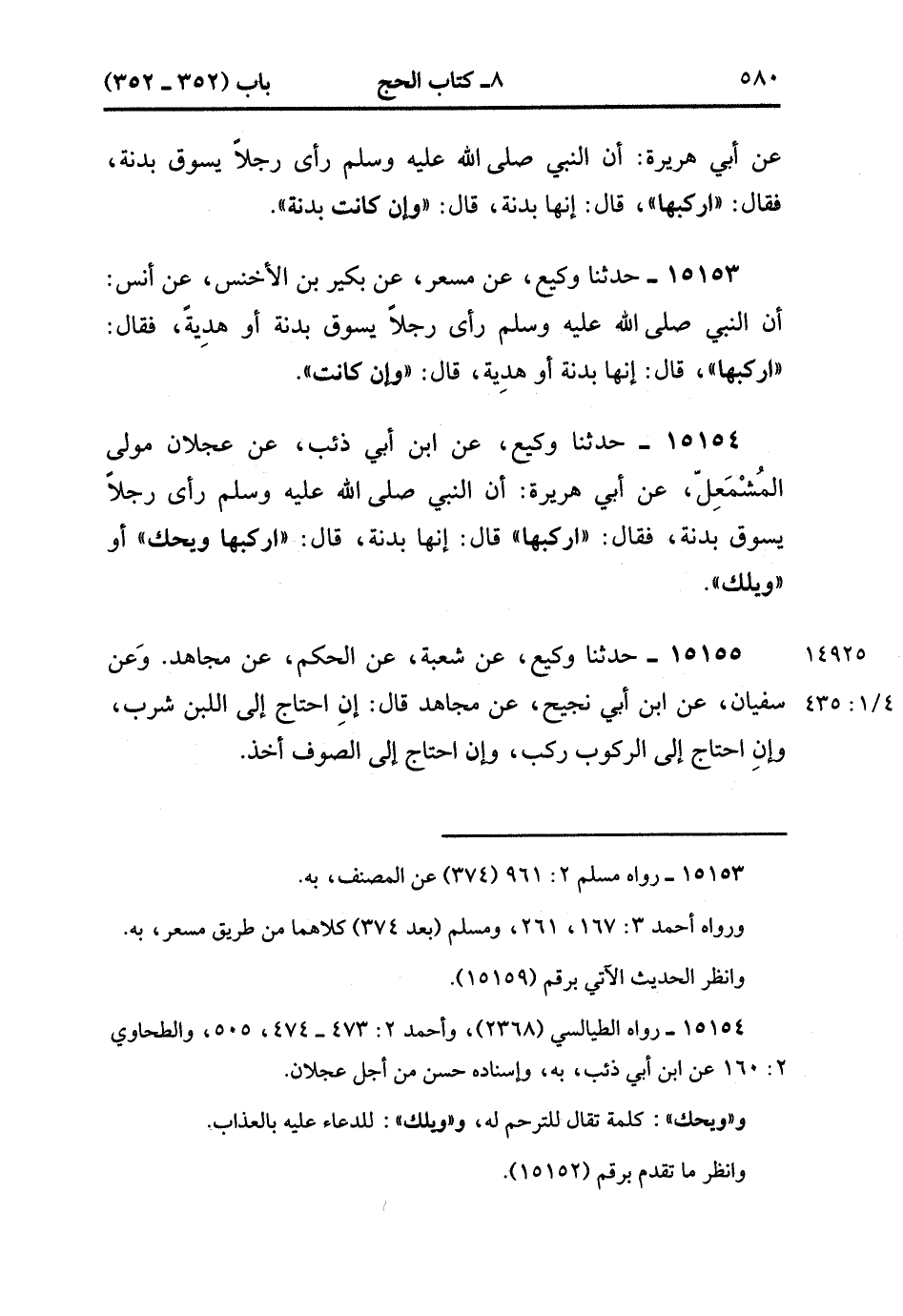 15154- حدَّثَنَا وَكِيعٌ ، عَنِ ابْنِ أَبِي ذِئْبٍ ، عَنْ عَجْلاَنَ مَوْلَى الْمُشْمَعِلَ ، عَنْ أَبِي هُرَيْرَةَ ؛ أَنَّ النَّبِيَّ صَلَّى الله عَلَيْهِ وَسَلَّمَ رَأَى رَجُلاً يَسُوقُ بَدَنَةً ، فَقَالَ : ارْكَبْهَا ، قَالَ : إِنَّهَا بَدَنَةٌ ، قَالَ ارْكَبْهَا وَيْحَكَ ، أَوْ وَيْلَكَ.