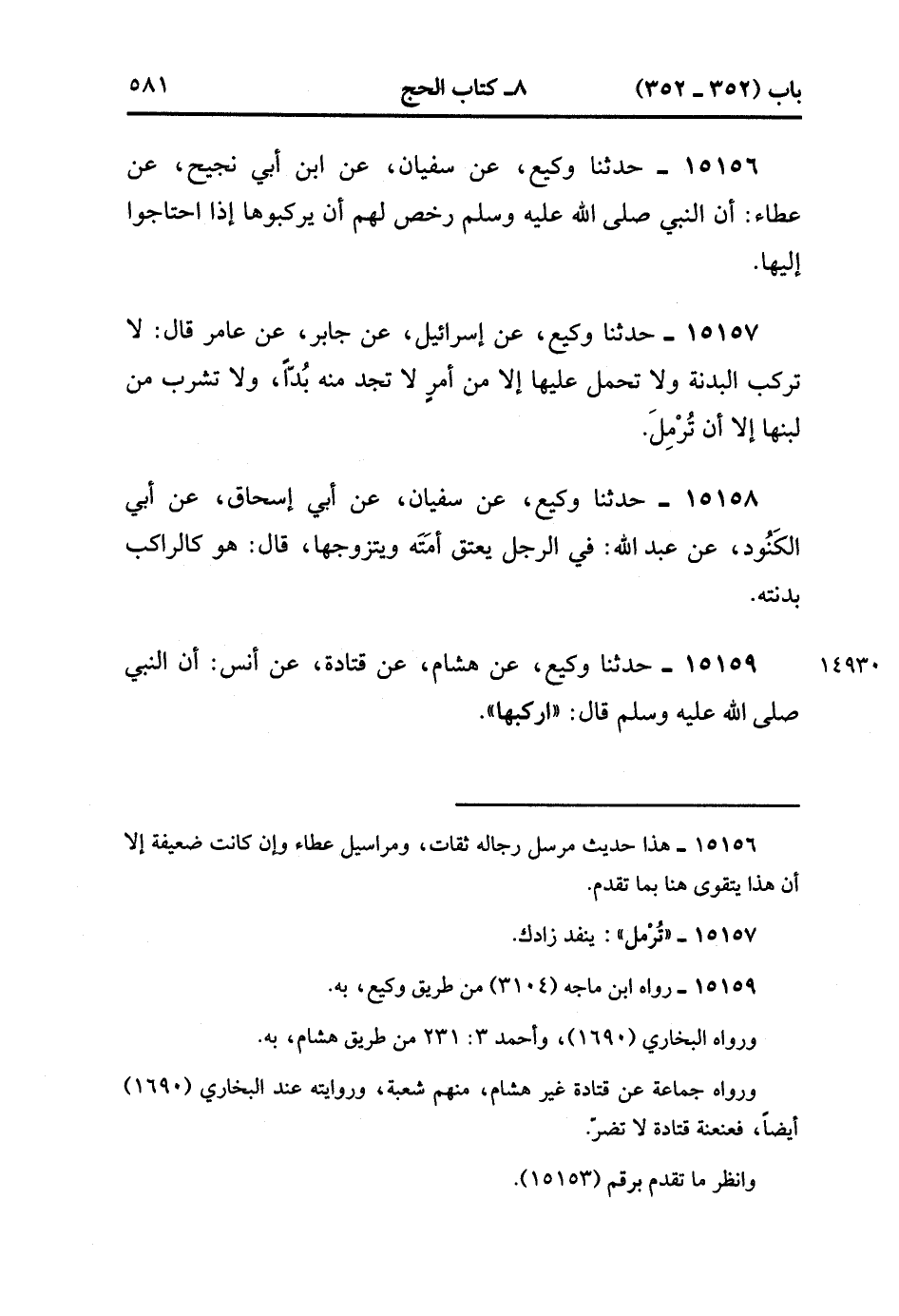 15159- حدَّثَنَا وَكِيعٌ ، عَنْ هِشَامٍ ، عَنْ قَتَادَةَ ، عَنْ أَنَسٍ ؛ أَنَّ النَّبِيَّ صَلَّى الله عَلَيْهِ وَسَلَّمَ ، قَالَ : ارْكَبْهَا. (4/435:1).