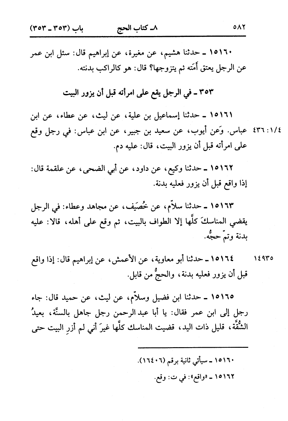 15161- حدَّثَنَا إِسْمَاعِيلُ ابْنُ عُلَيَّةَ ، عَنْ لَيْثٍ ، عَنْ عَطَاءٍ ، عَنِ ابْنِ عَبَّاسٍ (ح) وَعَنْ أَيُّوبَ ، عَنْ سَعِيدِ بْنِ جُبَيْرٍ ، عَنِ ابْنِ عَبَّاسٍ ؛ فِي رَجُلٍ وَقَعَ عَلَى امْرَأَتِهِ قَبْلَ أَنْ يَزُورَ الْبَيْتَ ، قَالَ : عَلَيْهِ دَمٌ. (4/435:1)