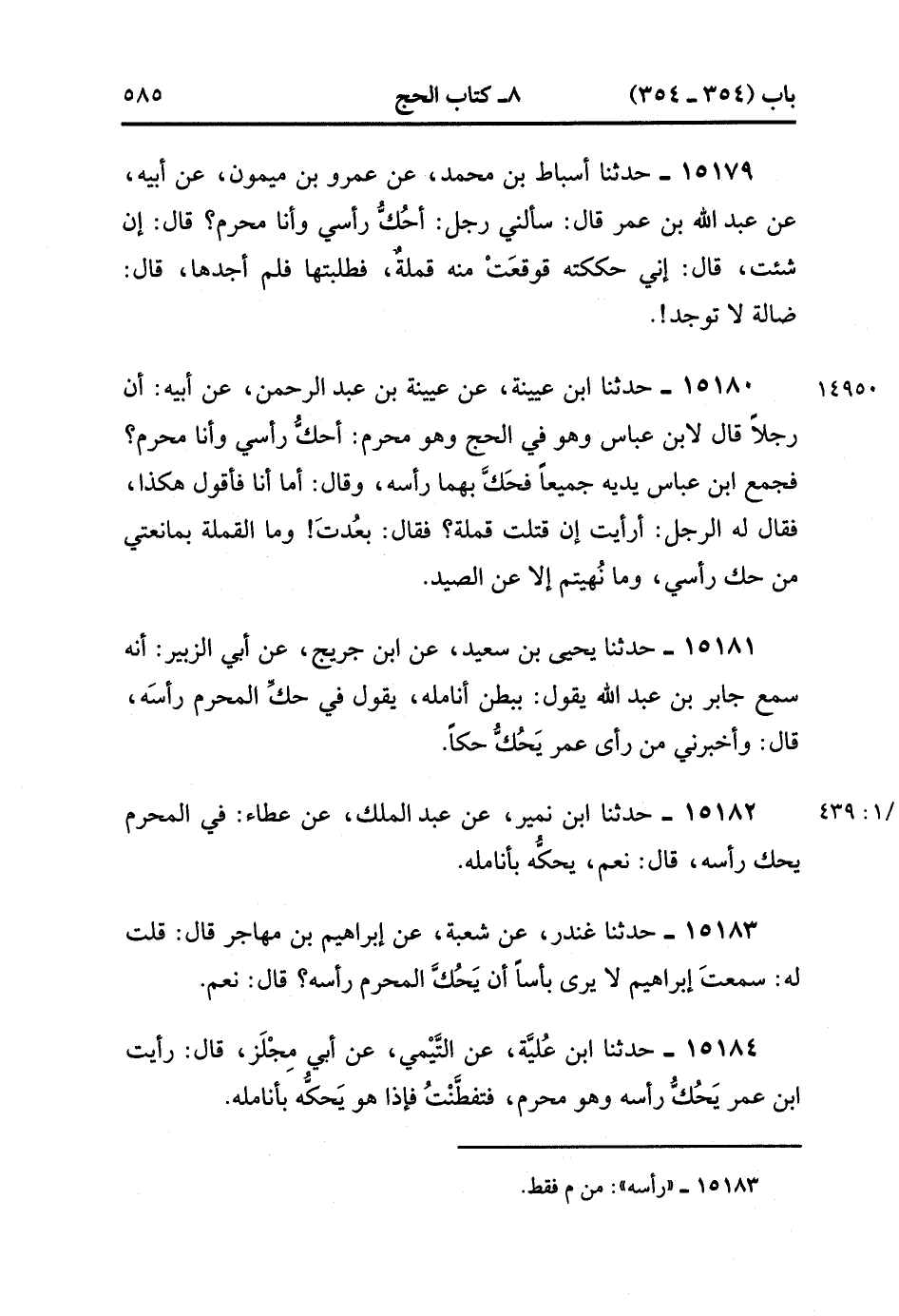 15184- حدَّثَنَا ابْنُ عُلَيَّةَ ، عَنِ التَّيْمِيِّ ، عَنْ أَبِي مِجْلَزٍ ، قَالَ : رَأَيْتُ ابْنَ عُمَرَ يَحُكَّ رَأْسَهُ وَهُوَ مُحْرِمٌ ، فَتَفَطَّنْتُ فَإِذَا هُوَ يَحُكَّهُ بِأَنَامِلِهِ. (4/439:1).