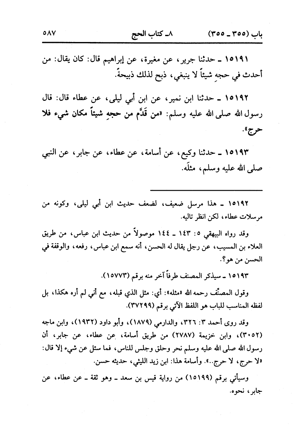 15192- حدَّثَنَا ابْنُ نُمَيْرٍ ، عَنِ ابْنِ أَبِي لَيْلَى ، عَنْ عَطَاءٍ ، قَالَ : قَالَ رَسُولُ اللهِ صَلَّى الله عَلَيْهِ وَسَلَّمَ : مَنْ قَدَّمَ مِنْ حَجِّهِ شَيْئًا مَكَانَ شَيْءٍ ، فَلاَ حَرَجَ.