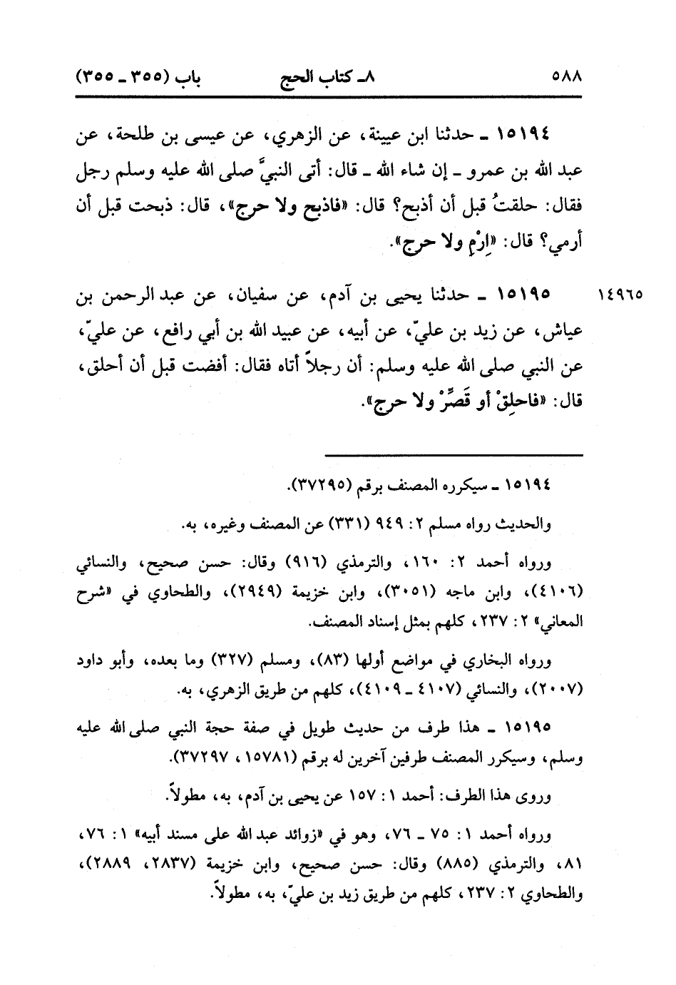 15195- حدَّثَنَا يَحْيَى بْنُ آدَمَ ، عَنْ سُفْيَانَ ، عَنْ عَبْدِ الرَّحْمَنِ بْنِ عَيَّاشٍ ، عَنْ زَيْدِ بْنِ عَلِيٍّ ، عَنْ أَبِيهِ ، عَنْ عُبَيْدِ اللهِ بْنِ أَبِي رَافِعٍ ، عَنْ عَلِيٍّ ، عَنِ النَّبِيِّ صَلَّى الله عَلَيْهِ وَسَلَّمَ ؛ أَنَّ رَجُلاً أَتَاهُ ، فَقَالَ : أَفَضْتُ قَبْلَ أَنْ أَحْلِقَ ، قَالَ : فَاحْلِقْ ، أَوْ قَصِّرْ وَلاَ حَرَجَ. (4/440:1).