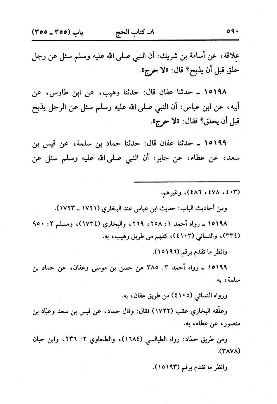 15199- حدَّثَنَا عَفَّانَ , قَالَ : حدَّثَنَا حَمَّادُ بْنُ سَلَمَةَ ، عَنْ قَيْسِ بْنِ سَعْدٍ ، عَنْ عَطَاءٍ ، عَنْ جَابِرٍ ؛ أَنَّ النَّبِيَّ صَلَّى الله عَلَيْهِ وَسَلَّمَ سُئِلَ عَنِ التَّقْدِيمِ وَالتَّأْخِيرِ فِي الْحَجِّ ؟ فَقَالَ : لاَ حَرَجَ. (4/441:1).