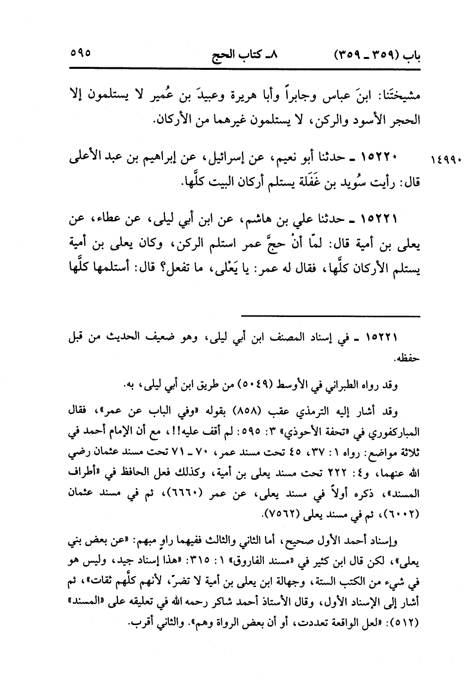 15221- حدَّثَنَا عَلِيُّ بْنُ هَاشِمٍ ، عَنِ ابْنِ أَبِي لَيْلَى ، عَنْ عَطَاءٍ ، عَنْ يَعْلَى بْنِ أُمَيَّةَ ، قَالَ : لَمَّا أَنْ حَجَّ عُمَرُ اسْتَلَمَ الرُّكْنَ ، وَكَانَ يَعْلَى بْنُ أُمَيَّةَ يَسْتَلِمُ الأَرْكَانَ كُلَّهَا ، فَقَالَ لَهُ عُمَرُ : يَا يَعْلَى ، مَا تَفْعَلُ ؟ قَالَ : أَسْتَلِمُهَا كُلَّهَا ، لأَنَّهُ لَيْسَ شَيْءٌ مِنَ الْبَيْتِ يُهْجَرُ ، قَالَ : فَقَالَ عُمَرُ : أَمَا رَأَيْتَ رَسُولَ اللهِ صَلَّى الله عَلَيْهِ وَسَلَّمَ لَمْ يَسْتَلِمْ مِنْهَا إِلاَّ الْحَجَرَ ؟ قَالَ : بَلَى ، قَالَ : فَمَا لَكَ بِهِ أُسْوَةً ؟ قَالَ : بَلَى. (4/444:1).
