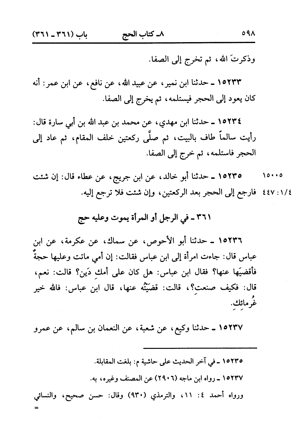 15233- حدَّثَنَا ابْنُ نُمَيْرٍ ، عَنْ عُبَيدِ اللهِ ، عَنْ نَافِعٍ ، عَنِ ابْنِ عُمَرَ ؛ أَنَّهُ كَانَ يَعُودُ إِلَى الْحَجَرِ فَيَسْتَلِمُهُ ، ثُمَّ يَخْرُجُ إِلَى الصَّفَا.