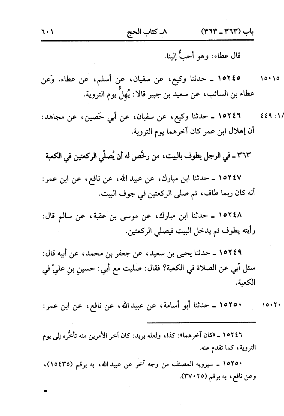 15246- حدَّثَنَا وَكِيعٌ ، عَنْ سُفْيَانَ ، عَنْ أَبِي حَصِينٍ ، عَنْ مُجَاهِدٍ ؛ أَنَّ إِهْلاَلَ ابْنِ عُمَرَ كَانَ آخِرَهُمَا يَوْمَ التَّرْوِيَةِ.