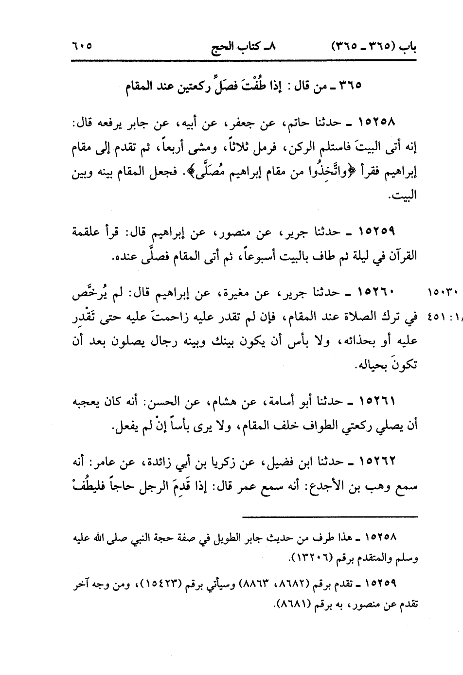 365- مَنْ قَالَ إِذَا طُفْتَ فَصَلِّ رَكْعَتَيْنِ عِنْدَ الْمَقَامِ.