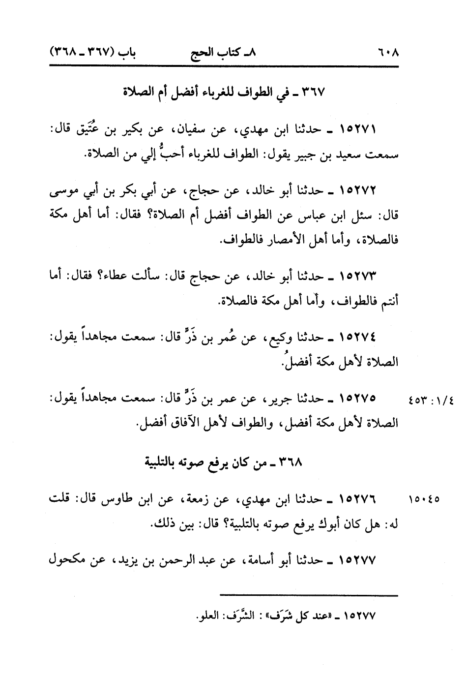 15276- حدَّثَنَا ابْنُ مَهْدِيٍّ ، عَنْ زَمْعَةَ ، عَنِ ابْنِ طَاوُوسٍ ، قَالَ : قُلْتُ لَهُ : هَلْ كَانَ أَبُوكَ يَرْفَعُ صَوْتَهُ بِالتَّلْبِيَةِ ؟ قَالَ : بَيْنَ ذَلِكَ. (4/453:1).