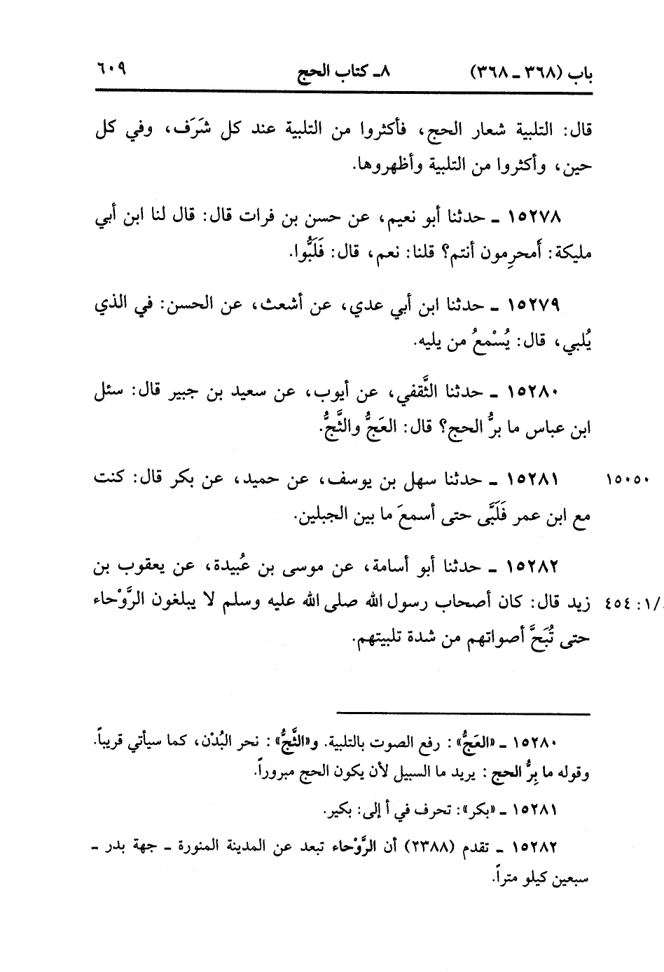 15282- حدَّثَنَا أَبُو أُسَامَةَ ، عَنْ مُوسَى بْنِ عُبَيْدَةَ ، عَنْ يَعْقُوبَ بْنِ زَيْدٍ ، قَالَ : كَانَ أَصْحَابُ رَسُولِ اللهِ صَلَّى الله عَلَيْهِ وَسَلَّمَ لاَ يَبْلُغُونَ الرَّوْحَاءَ ، حَتَّى تُبَحَّ أَصْوَاتُهُمْ مِنْ شِدَّةِ تَلْبِيَتِهِمْ. (4/453:1).