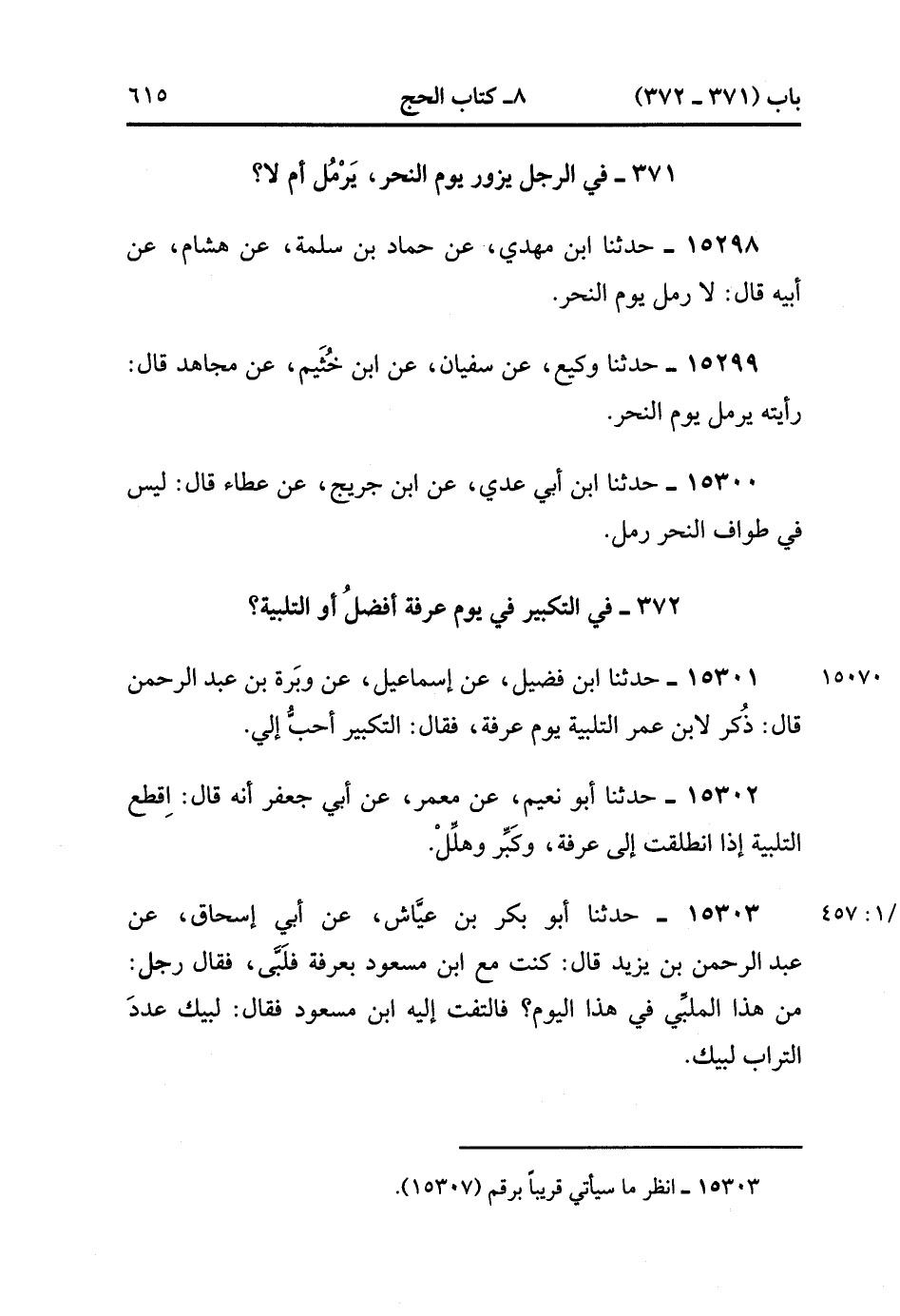 15303- حدَّثَنَا أَبُو بَكْرٍ بْنُ عَيَّاشٍ ، عَنْ أَبِي إِسْحَاقَ ، عَنْ عَبْدِ الرَّحْمَنِ بْنِ يَزِيدَ ، قَالَ : كُنْتُ مَعَ ابْنِ مَسْعُودٍ بِعَرَفَةَ فَلَبَّى ، فَقَالَ رَجُلٌ : مَنْ هَذَا الْمُلَبِّي ، فِي هَذَا الْيَوْمِ ؟ فَالْتَفَتَ إِلَيْهِ ابْنُ مَسْعُودٍ ، فَقَالَ : لَبَّيْكَ عَدَدَ التُّرَابِ لَبَّيْكَ. (4/457:1).