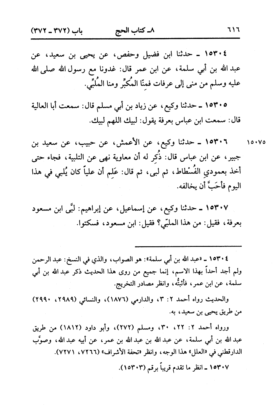 15307- حدَّثَنَا وَكِيعٌ ، عَنْ إِسْمَاعِيلَ ، عَنْ إِبْرَاهِيمَ ، لَبَّى ابْنُ مَسْعُودٍ بِعَرَفَةَ ، فَقِيلَ : مَنْ هَذَا الْمُلَبِّي ؟ فَقِيلَ : ابْنُ مَسْعُودٍ ، فَسَكَتُوا. (4/457:1).