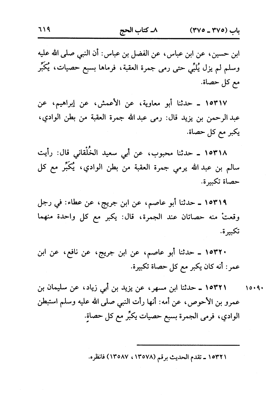 15321- حدَّثَنَا ابْنُ مُسْهِرٍ ، عَنْ يَزِيدَ بْنِ أَبِي زِيَادٍ ، عَنْ سُلَيْمَانَ بْنِ عَمْرِو بْنِ الأَحْوَص ، عَنْ أُمِّهِ ؛ أَنَّهَا رَأَتِ النَّبِيَّ صَلَّى الله عَلَيْهِ وَسَلَّمَ اسْتَبْطَنَ الْوَادِيَ ، فَرَمَى الْجَمْرَةَ بِسَبْعِ حَصَيَاتٍ ، يُكَبِّرُ مَعَ كُلِّ حَصَاةٍ. (4/459:1).