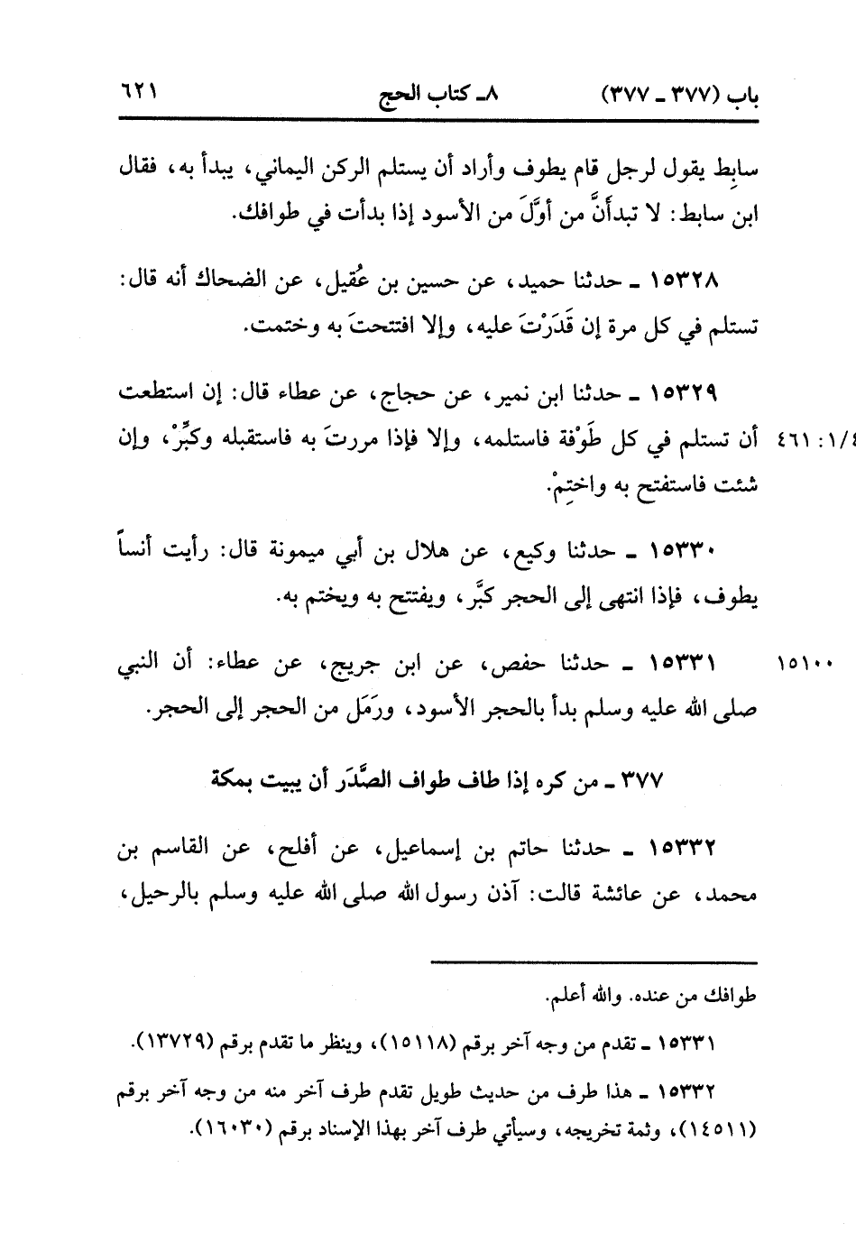 15332- حدَّثَنَا حَاتِمُ بْنُ إسْمَاعِيلَ ، عَنْ أَفْلَحَ ، عَنِ الْقَاسِمِ بْنِ مُحَمَّدٍ ، عَنْ عَائِشَةَ قَالَتْ : آذَنَ رَسُولُ اللهِ صَلَّى الله عَلَيْهِ وَسَلَّمَ بِالرَّحِيلِ ، فَمَرَرْنَا بِالْبَيْتِ ، فَطَافَ بِهِ رَسُولُ اللهِ صَلَّى الله عَلَيْهِ وَسَلَّمَ ثُمَّ خَرَجَ قَبْلَ أَنْ يُصْبِحَ. (4/461:1).