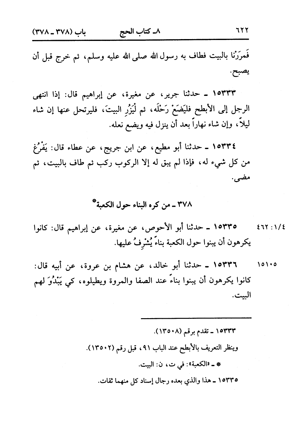 15335- حدَّثَنَا أَبُو الأَحْوَصِ ، عَنْ مُغِيرَةَ ، عَنْ إبْرَاهِيمَ ، قَالَ : كَانُوا يَكْرَهُونَ أَنْ يَبْنُوا حَوْلَ الْكَعْبَةِ بِنَاءً ، يُشْرِفُ عَلَيْهَا.