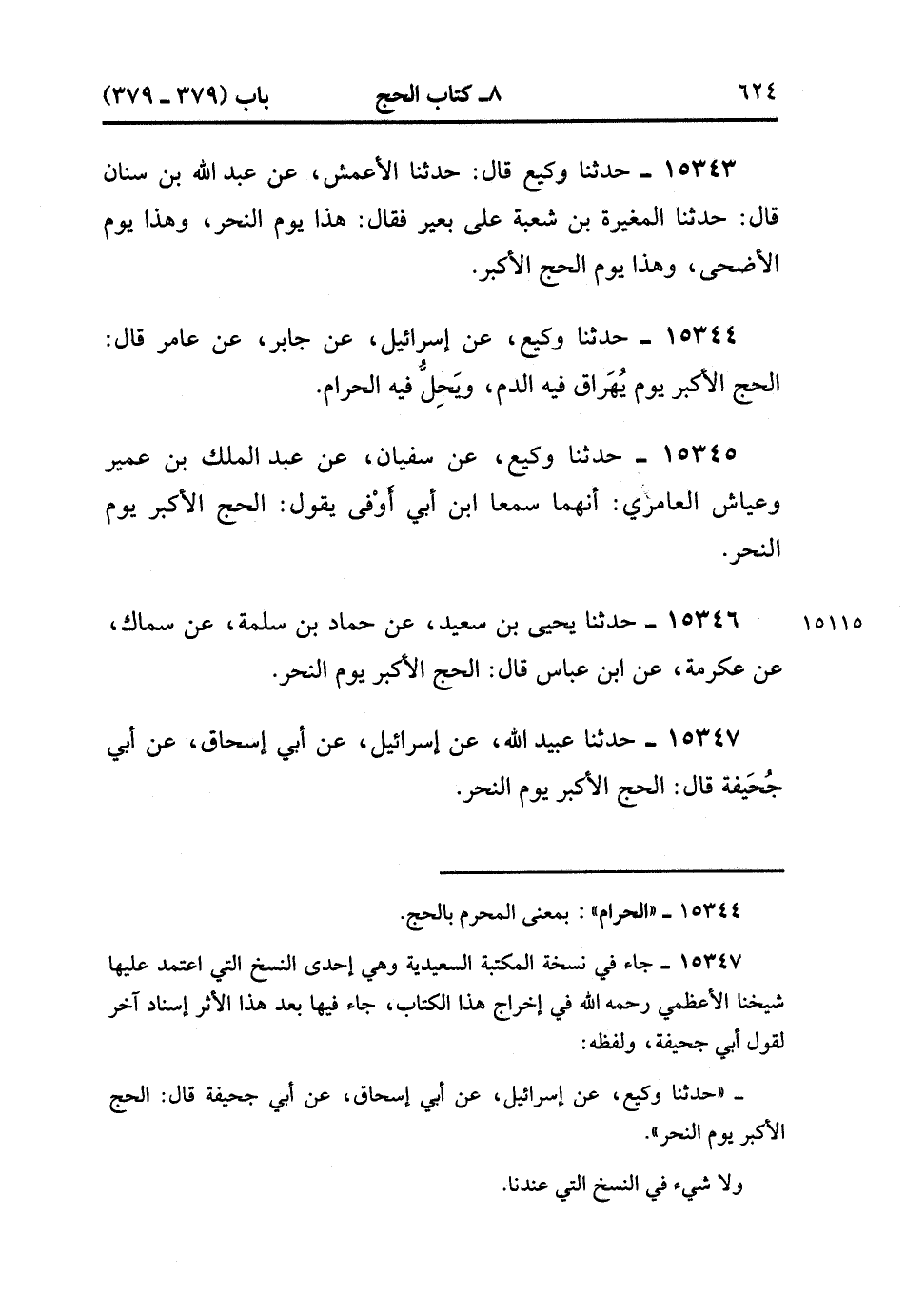 15347- حدَّثَنَا عُبَيْدُ اللهِ ، عَنْ إسْرَائِيلَ ، عَنْ أَبِي إِسْحَاقَ ، عَنْ أَبِي جُحَيْفَةَ ، قَالَ : الْحَجُّ الأَكْبَرُ يَوْمُ النَّحْرِ. (4/463:1).