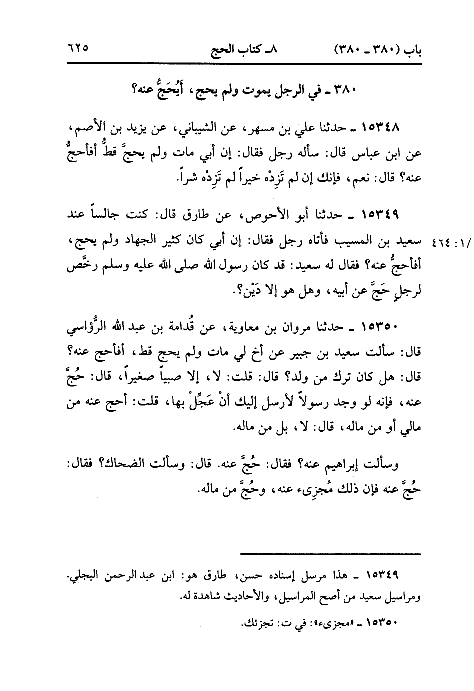 15349- حدَّثَنَا أَبُو الأَحْوَصِ ، عَنْ طَارِقٍ ، قَالَ : كُنْتُ جَالِسًا عِنْدَ سَعِيدِ بْنِ الْمُسَيَّبِ ، فَأَتَاهُ رَجُلٌ ، فَقَالَ : إِنَّ أَبِي كَانَ كَثِيرَ الْجِهَادِ ، وَلَمْ يَحُجَّ ، أَفَأَحُجُّ عَنْهُ ؟ فَقَالَ لَهُ سَعِيدٌ : قَدْ كَانَ رَسُولُ اللهِ صَلَّى الله عَلَيْهِ وَسَلَّمَ رَخَّصَ لِرَجُلٍ حَجَّ عَنْ أَبِيهِ ، وَهَلْ هُوَ إِلاَّ دَيْنٌ ؟. (4/463:1)