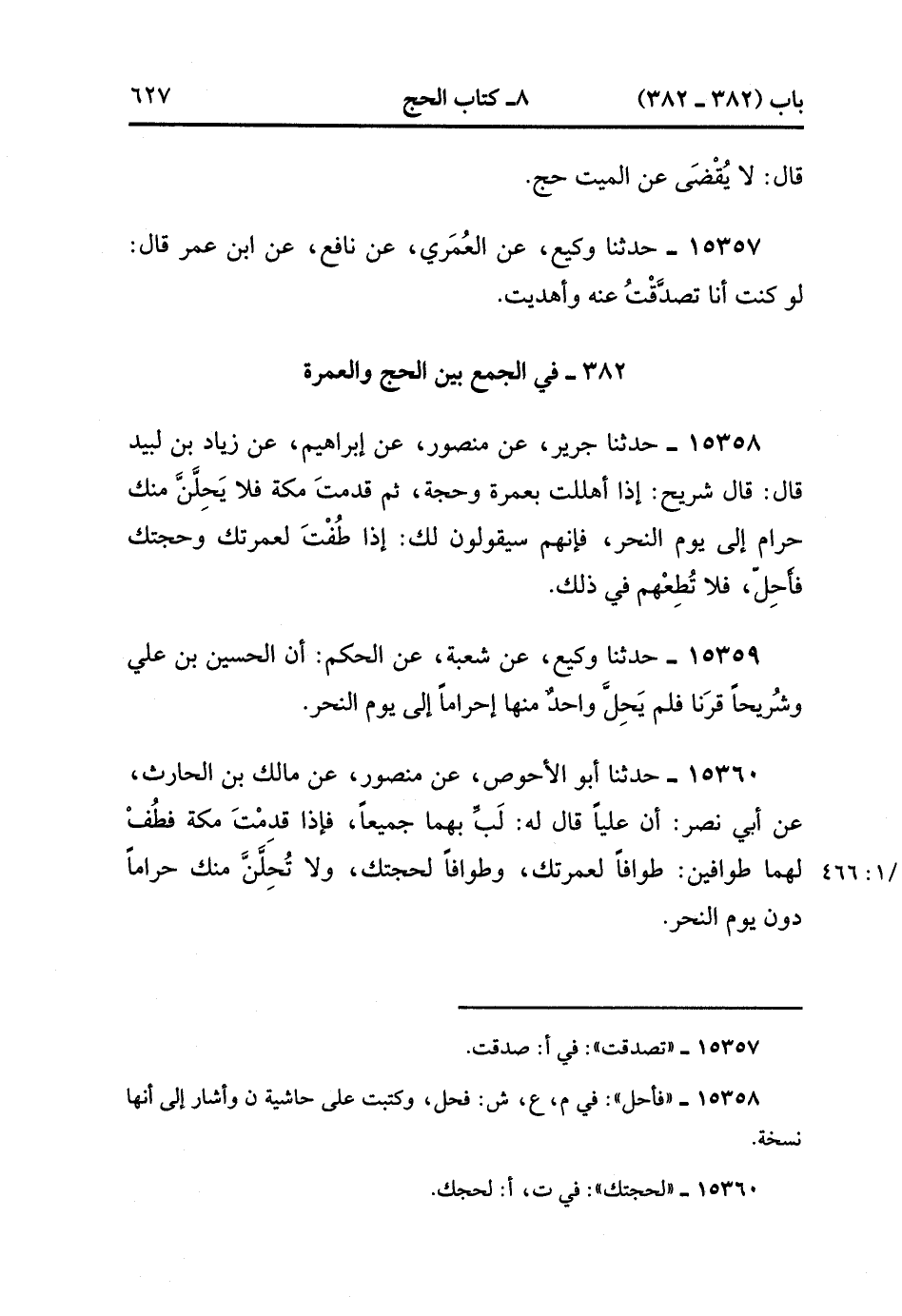 15360- حدَّثَنَا أَبُو الأَحْوَصِ ، عَنْ مَنْصُورٍ ، عَنْ مَالِكِ بْنِ الْحَارِثِ ، عَنْ أَبِي نَصْرٍ ؛ أَنَّ عَلِيًّا ، قَالَ لَهُ : لَبِّ بِهِمَا جَمِيعًا ، فَإِذَا قَدِمْتَ مَكَّةَ ، فَطُفْ لَهُمَا طَوَافَيْنِ ؛ طَوَافًا لِعُمْرَتِكَ ، وَطَوَافًا لِحَجَّتِكَ ، وَلاَ تُحِلَّنَّ مِنْكَ حَرَامًا دُونَ يَوْمِ النَّحْرِ. (4/465:1).