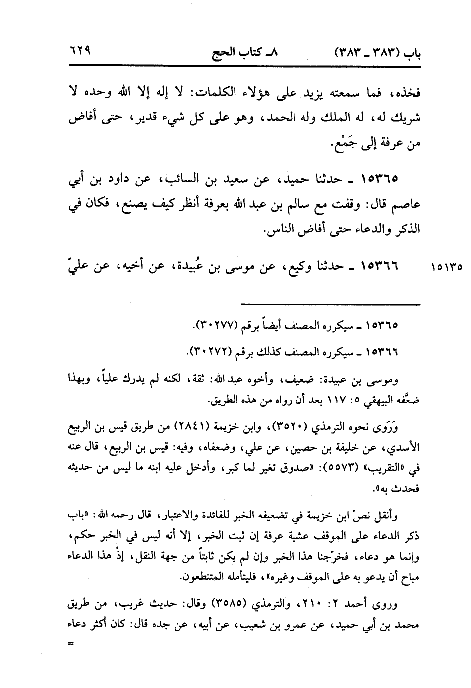 15365- حدَّثَنَا حُمَيْدٌ ، عَنْ سَعِيدِ بْنِ السَّائِبِ ، عَنْ دَاوُدَ بْنِ أَبِي عاصِمٍ ، قَالَ : وَقَفْت مَعَ سَالِمِ بْنِ عَبْدِ اللهِ بِعَرَفَةَ ، أَنْظُرُ كَيْفَ يَصْنَعُ ؟ ، فَكَانَ فِي الذِّكْرِ وَالدُّعَاءِ حَتَّى أَفَاضَ النَّاسُ. (4/466:1).