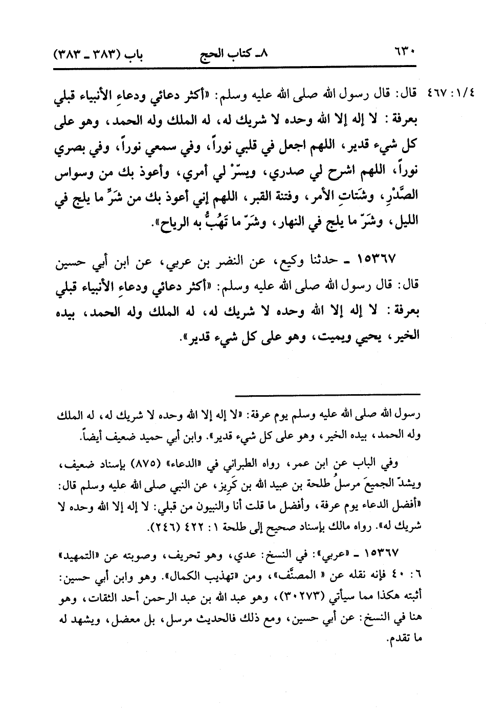 15367- حدَّثَنَا وَكِيعٌ ، عَنِ النَّضْرِ بْنِ عَرَبِيٍّ ، عَنِ ابْنِ أَبِي حُسَيْنٍ ، قَالَ : قَالَ رَسُولُ اللهِ صَلَّى الله عَلَيْهِ وَسَلَّمَ : أَكْثَرُ دُعَائِي وَدُعَاءِ الأَنْبِيَاءِ قَبْلِي بِعَرَفَةَ ؛ لاَ إلَهَ إِلاَّ اللَّهُ وَحْدَهُ لاَ شَرِيكَ لَهُ ، لَهُ الْمُلْكُ وَلَهُ الْحَمْدُ ، بِيَدِهِ الْخَيْرُ ، يُحْيِي وَيُمِيتُ ، وَهُوَ عَلَى كُلِّ شَيْءٍ قَدِيرٌ. (4/467:1).