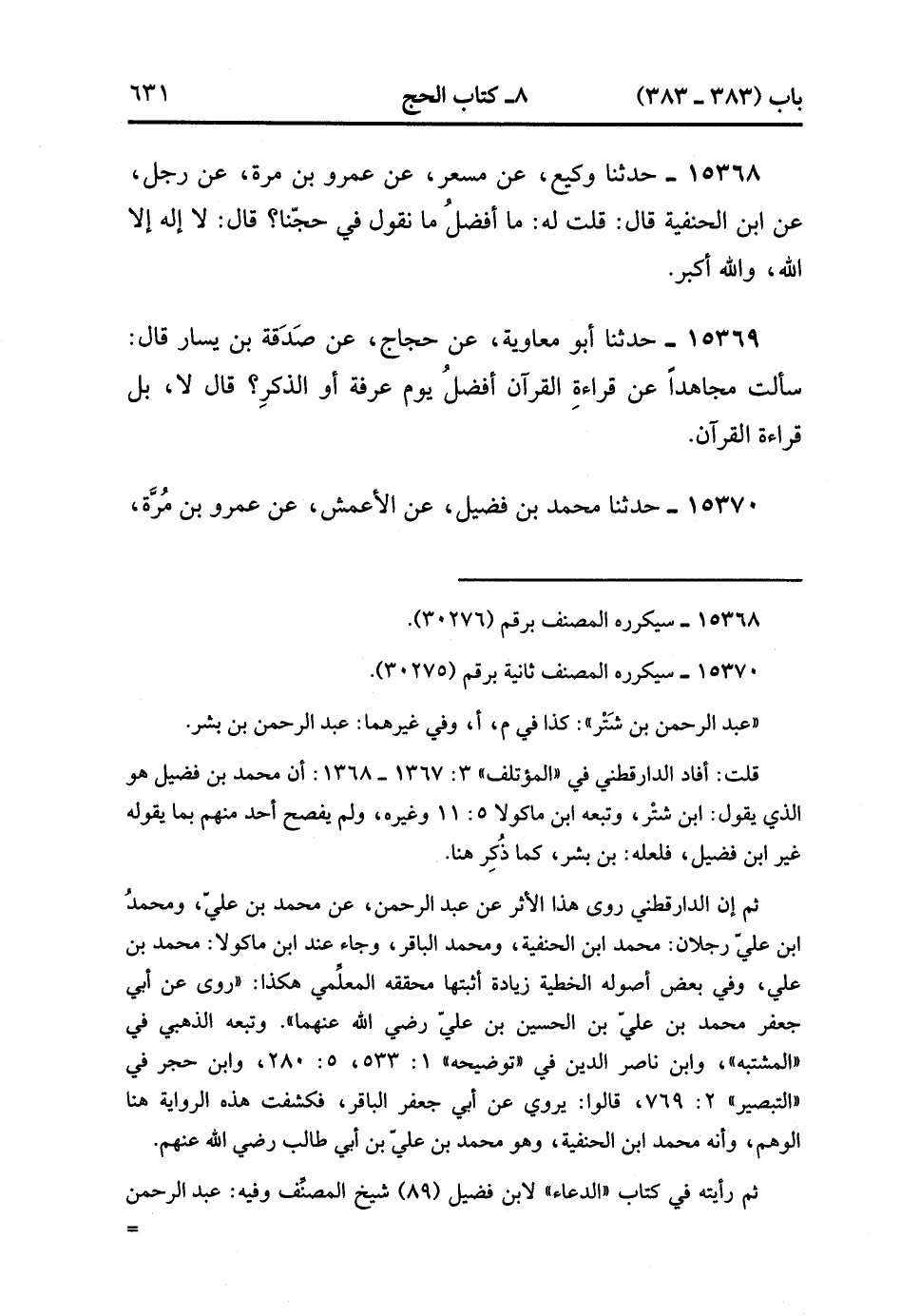 15370- حدَّثَنَا مُحَمَّدُ بْنُ فُضَيْلٍ ، عَنِ الأَعْمَشِ ، عَنْ عَمْرِو بْنِ مُرَّةَ ، عَنْ عَبْدِ الرَّحْمَنِ بْنِ شَتْرٍ ، قَالَ : قُلْتُ لابْنِ الْحَنَفِيَّةِ : مَا أَفْضَلُ مَا نَقُولُ فِي حَجِّنَا ؟ قَالَ : لاَ إلَهَ إِلاَّ اللَّهُ ، وَاللَّهُ أَكْبَرُ. (4/467:1).