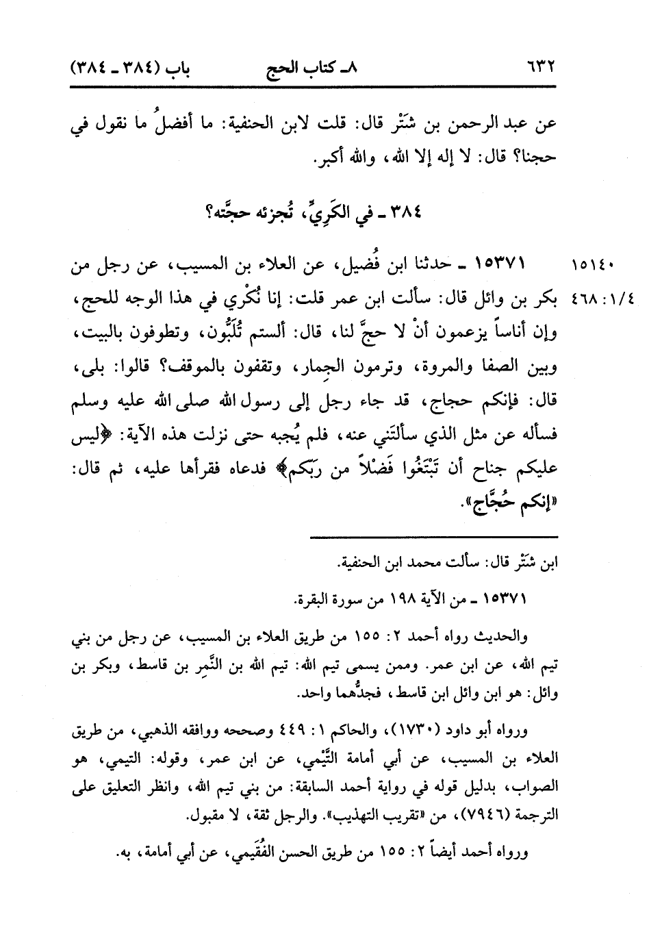 15371- حدَّثَنَا ابْنُ فُضَيْلٍ ، عَنِ الْعَلاَءِ بْنِ الْمُسَيَّبِ ، عَنْ رَجُلٍ ، مِنْ بَكْرِ بْنِ وَائِلٍ ، قَالَ : سَأَلْتُ ابْنَ عُمَرَ ، قُلْتُ : إنَّا نُكْرِي فِي هَذَا الْوَجْهِ للْحَجَّ ، وَإِنَّ أُنَاسًا يَزْعُمُونَ أَنْ لاَ حَجَّ لَنَا ، قَالَ : أَلَسْتُمْ تُلَبُّونَ ، وَتَطُوفُونَ بِالْبَيْتِ وَبَيْنَ الصَّفَا وَالْمَرْوَةِ ، وَتَرْمُونَ الْجِمَارَ ، وَتَقِفُونَ بِالْمَوْقِفِ ؟ قَالُوا : بَلَى ، قَالَ : فَإِنَّكُمْ حُجَّاجٌ ، قَدْ جَاءَ رَجُلٌ إِلَى رَسُولِ اللهِ صَلَّى الله عَلَيْهِ وَسَلَّمَ فَسَأَلَهُ عَنْ مِثْلِ الَّذِي سَأَلْتَنِي عَنْهُ فَلَمْ يُجِبْهُ حَتَّى نَزَلَتْ هَذِهِ الآيَةُ : {لَيْسَ عَلَيْكُمْ جُنَاحٌ أَنْ تَبْتَغُوا فَضْلاً مِنْ رَبِّكُمْ} فَدَعَاهُ فَقَرَأَهَا عَلَيْهِ ، ثُمَّ قَالَ : إِنَّكُمْ حُجَّاجٌ. (4/467:1).