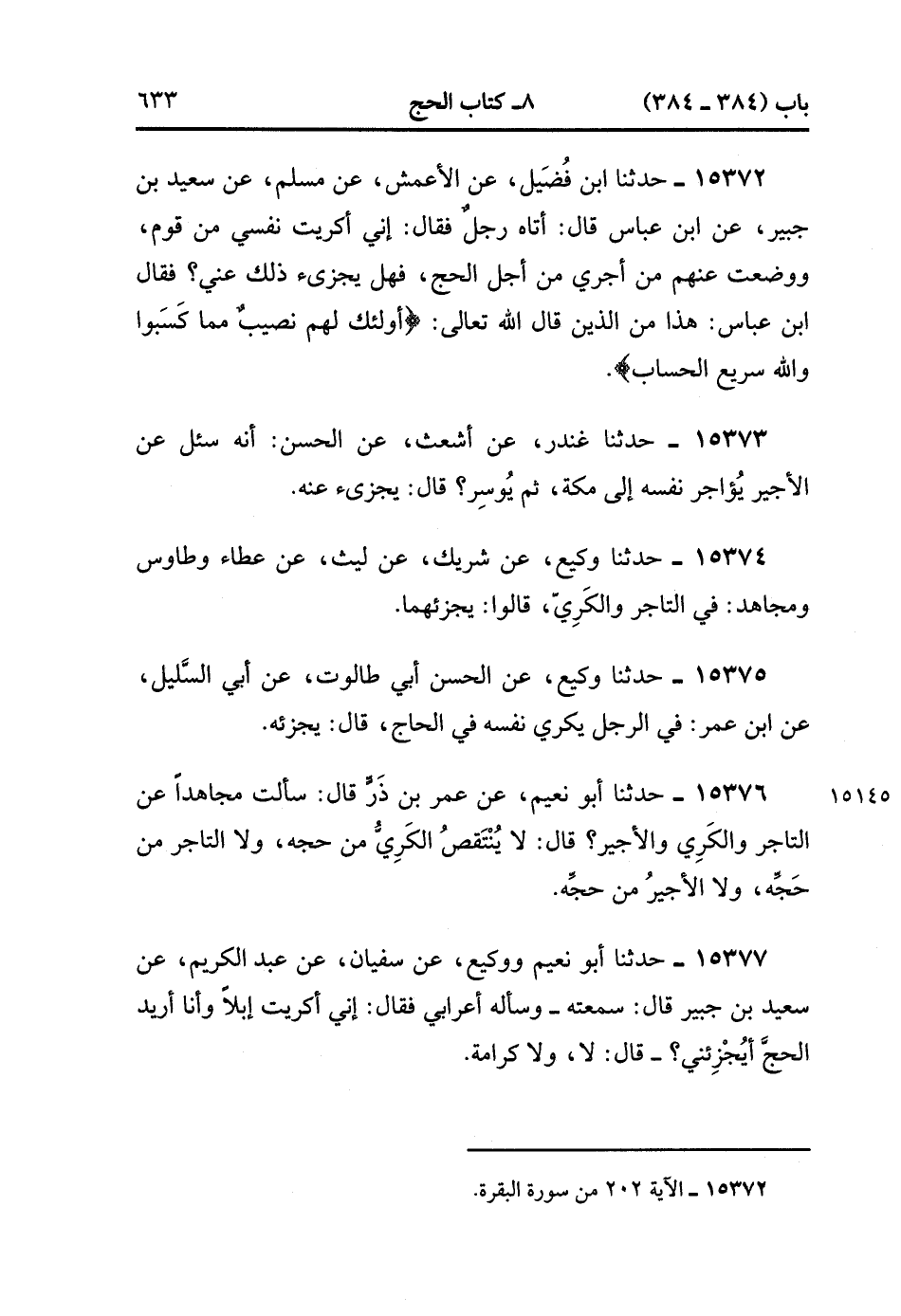 15377- حدَّثَنَا أَبُو نُعَيْمٍ ، وَوَكِيعٌ ، عَنْ سُفْيَانَ ، عَنْ عَبْدِ الْكَرِيمِ ، عَنْ سَعِيدِ بْنِ جُبَيْرٍ ، قَالَ : سَمِعْتُهُ وَسَأَلَهُ أَعْرَابِيٌّ ، فَقَالَ : إِنِّي أَكْرِيْتُ إِبِلاً وَأَنَا أُرِيدُ الْحَجَّ ، أَيُجْزِئُنِي ؟ قَالَ : لاَ ، وَلاَ كَرَامَةَ. (4/468:1).