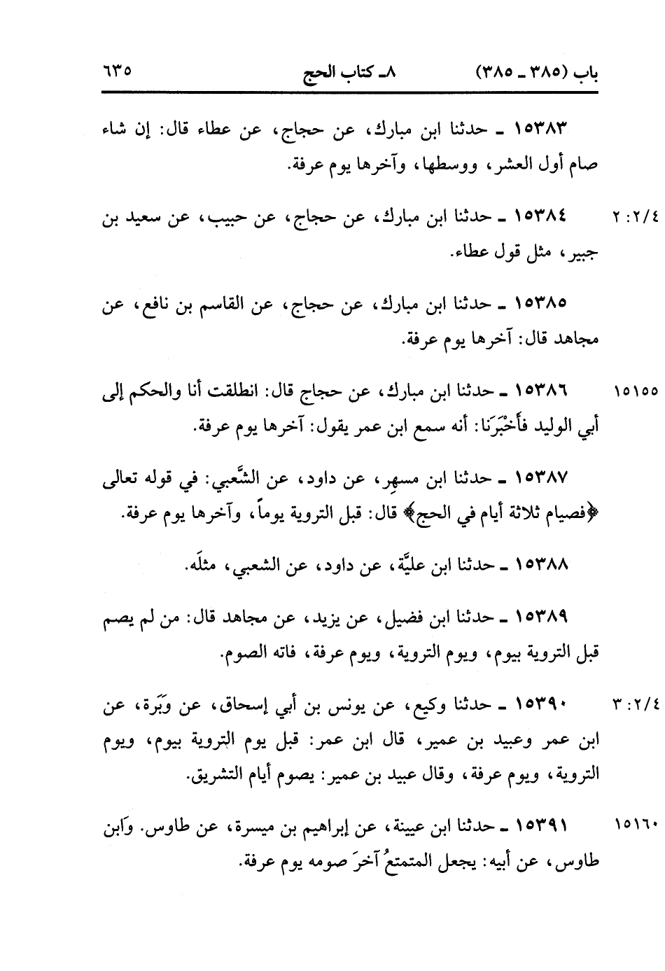 15386- حَدَّثَنَا ابْنُ مُبَارَكٍ , عَنِ حَجَّاجٍ ، قَالَ : انْطَلَقْت أَنَا وَالْحَكَمُ إلَى أَبِي الْوَلِيدِ فَأَخْبَرَنَا ، أَنَّهُ سَمِعَ ابْنَ عُمَرَ يَقُولُ : آخِرُهَا يَوْمُ عَرَفَةَ.