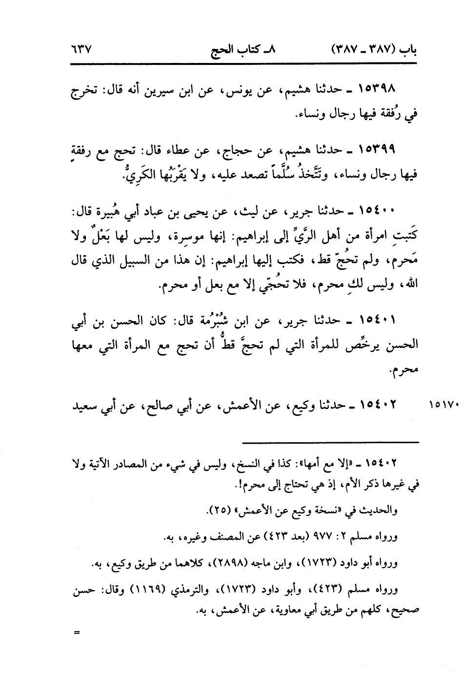 15402- حَدَّثَنَا وَكِيعٌ , عَنِ الأَعْمَشِ ، عَنْ أَبِي صَالِحٍ ، عَنْ أَبِي سَعِيدٍ ، قَالَ : قَالَ رَسُولُ اللهِ صَلَّى الله عَلَيْهِ وَسَلَّمَ : لاَ تُسَافِرُ الْمَرْأَةُ سَفَرًا يَكُونُ ثَلاَثَةَ أَيَّامٍ فصاعدًا إِلاَّ مَعَ أمها ، أَوِ ابْنِهَا ، أو أَبِيهَا , أَوْ أَخِيهَا ، أَوْ زَوْجِهَا ، أَوْ ذِي مَحْرَمٍ. (4/4:2).