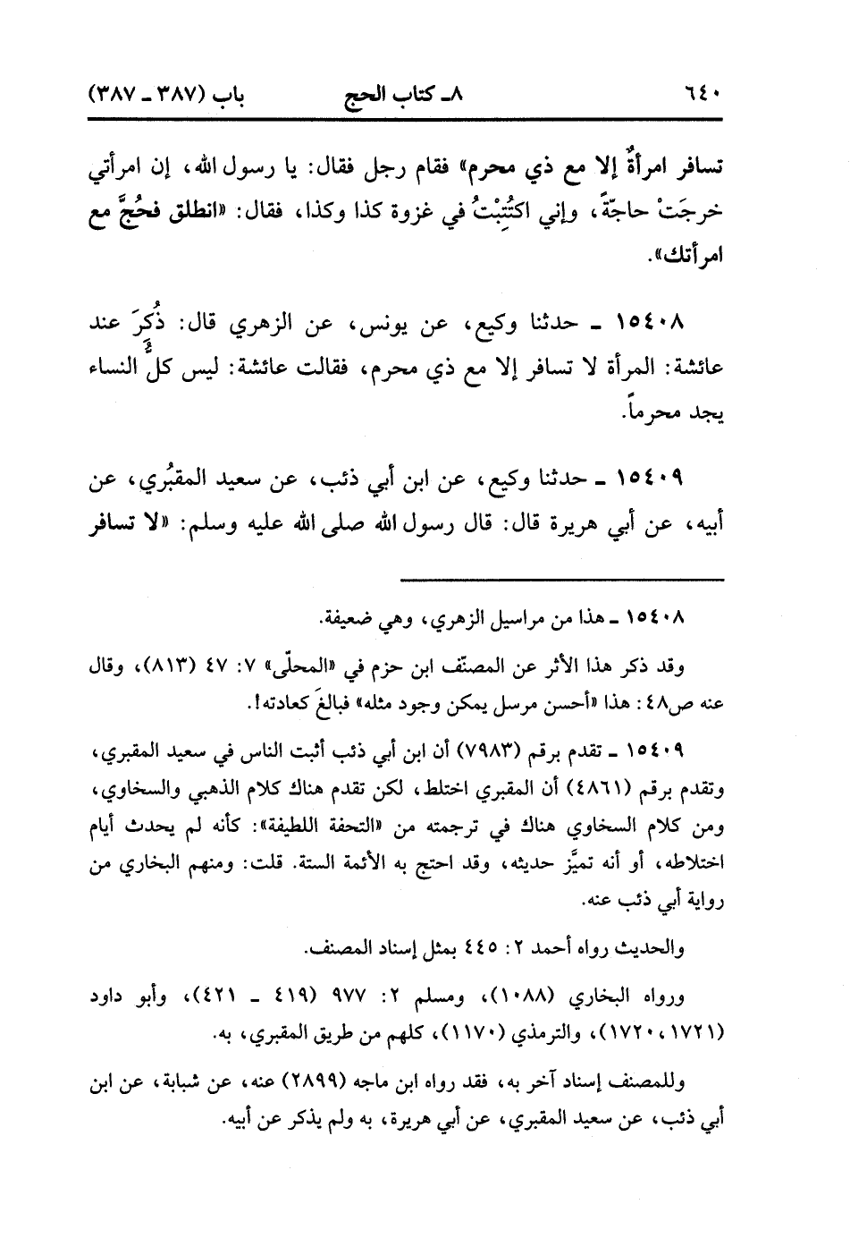 15409- حَدَّثَنَا وَكِيعٌ , عَنِ ابْنِ أَبِي ذِئْبٍ , عَنْ سَعِيدٍ الْمَقْبُرِيِّ , عَنْ أَبِيهِ , عَنْ أَبِي هُرَيْرَةَ ، قَالَ : قَالَ رَسُولُ اللهِ صَلَّى الله عَلَيْهِ وَسَلَّمَ : لاَ تُسَافِرُ امْرَأَةٌ مَسِيرَةَ يَوْمٍ تَامٍّ إِلاَّ مَعَ ذِي مَحْرَمٍ. (4/6:2).