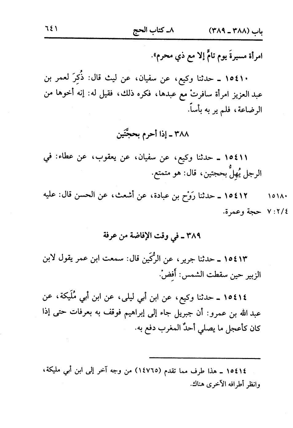 15414- حَدَّثَنَا وَكِيعٌ , عَنِ ابْنِ أَبِي لَيْلَى , عَنِ ابْنِ أَبِي مُلَيْكَةَ , عَنْ عَبْدِ اللهِ بْنِ عَمْرٍو ، أَنَّ جِبْرِيلَ جَاءَ إلَى إبْرَاهِيمَ فَوَقَفَ بِعَرَفَاتٍ حَتَّى إذَا كَانَ كَأَعْجَلِ مَا يُصَلِّي أَحَدٌ الْمَغْرِبَ دَفَعَ بِهِ. (4/7:2).