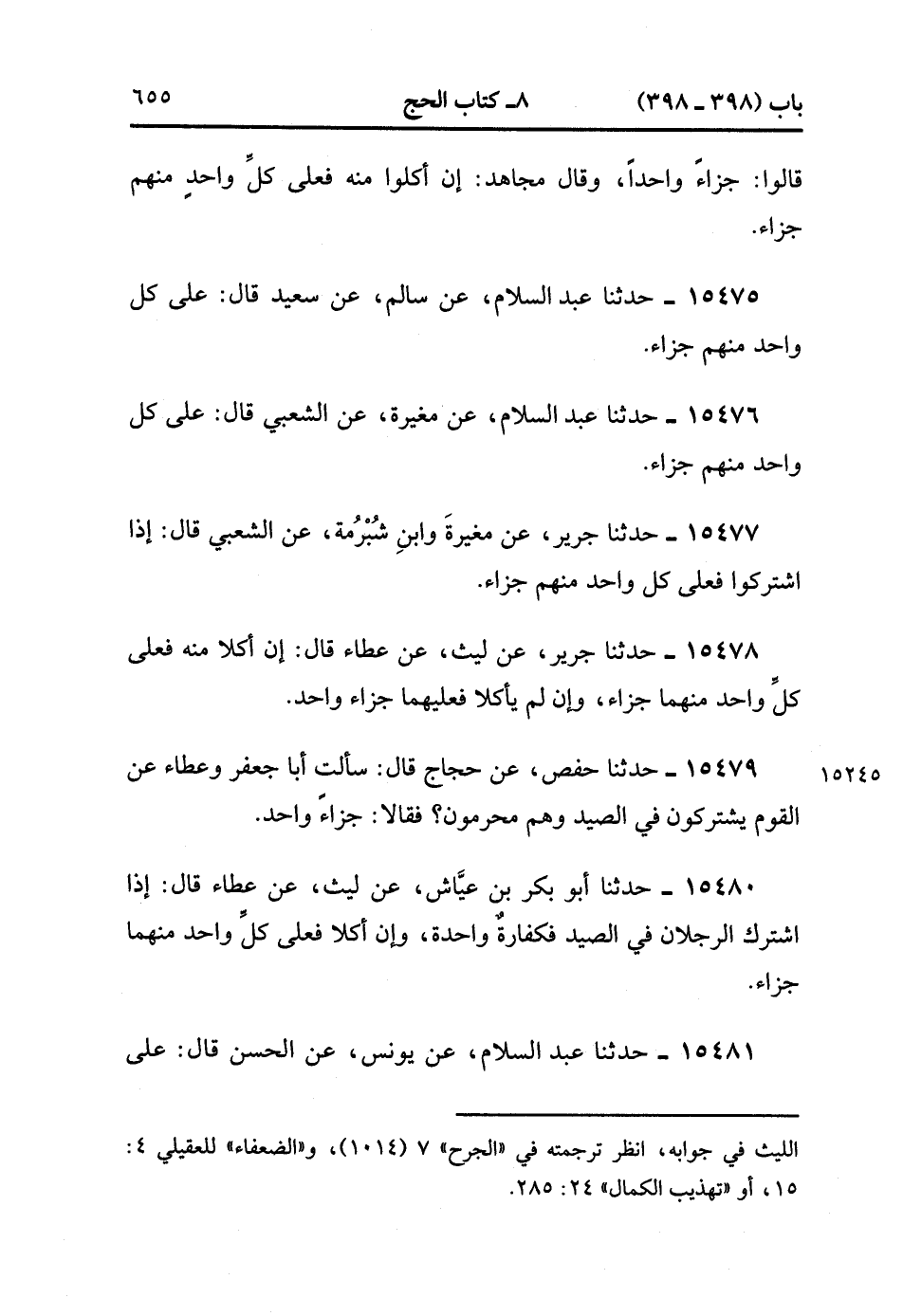 15480- حَدَّثَنَا أَبُو بَكْرِ بْنُ عَيَّاشٍ , عَنْ لَيْثٍ , عَنْ عَطَاءٍ ، قَالَ : إذَا اشْتَرَكَ الرَّجُلاَنِ فِي الصَّيْدِ فَكَفَّارَةٌ وَاحِدَةٌ ، وَإِنْ أَكَلاَ فَعَلَى كُلِّ وَاحِدٍ مِنْهُمَا جَزَاءٌ.