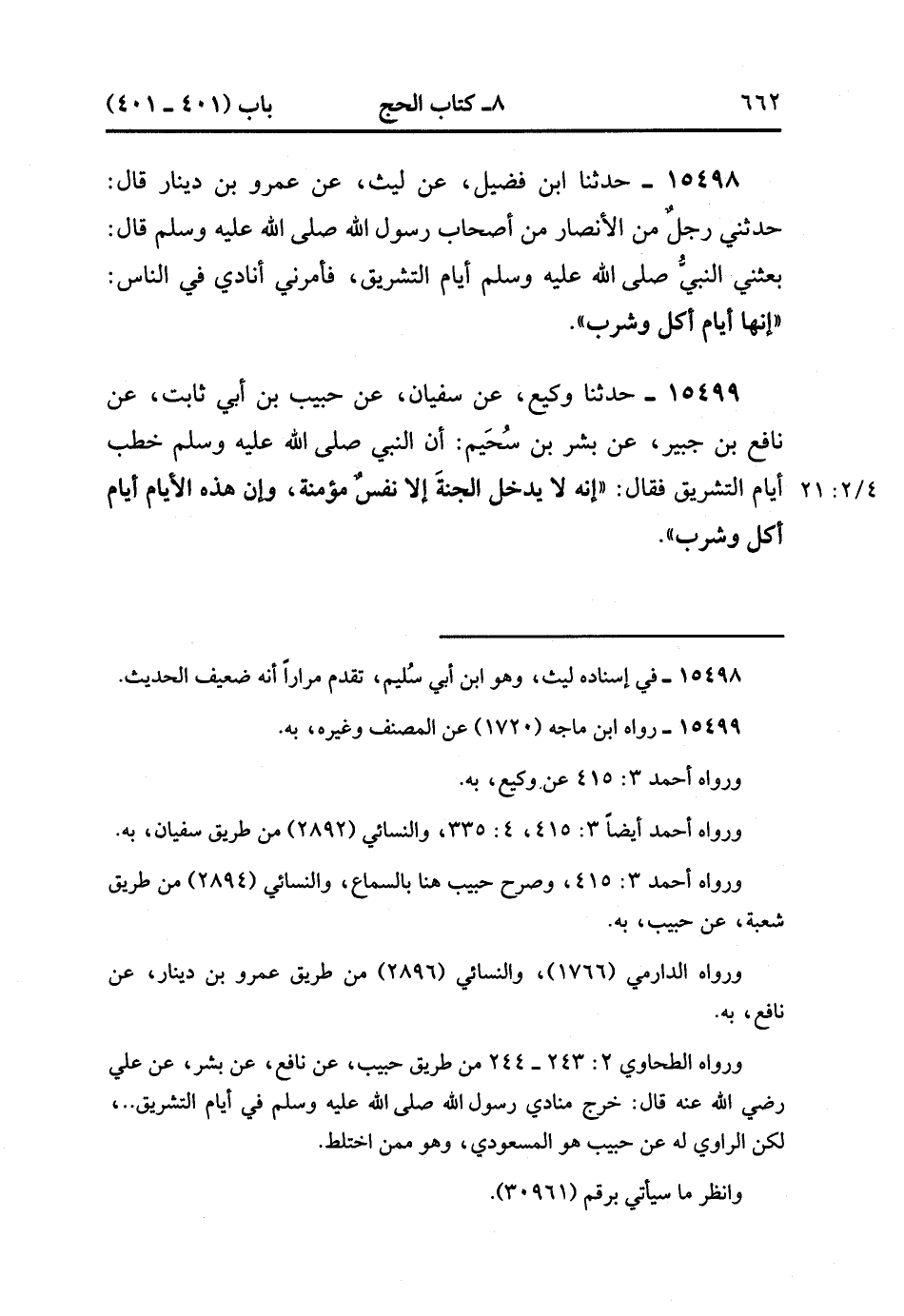 15499- حَدَّثَنَا وَكِيعٌ , عَنْ سُفْيَانَ , عَنْ حَبِيبِ بْنِ أَبِي ثَابِتٍ , عَنْ نَافِعِ بْنِ جُبَيْرٍ , عَنْ بِشْرِ بْنِ سُحَيْمٍ ، أَنَّ النَّبِيَّ صَلَّى الله عَلَيْهِ وَسَلَّمَ خَطَبَ أَيَّامَ التَّشْرِيقِ ، فَقَالَ : إِنَّهُ لاَ يَدْخُلُ الْجَنَّةَ إِلاَّ نَفْسٌ مُؤْمِنَةٌ ، وَإِنَّ هَذِهِ الأَيَّامَ أَيَّامُ أَكْلٍ وَشُرْبٍ. (4/20:2).