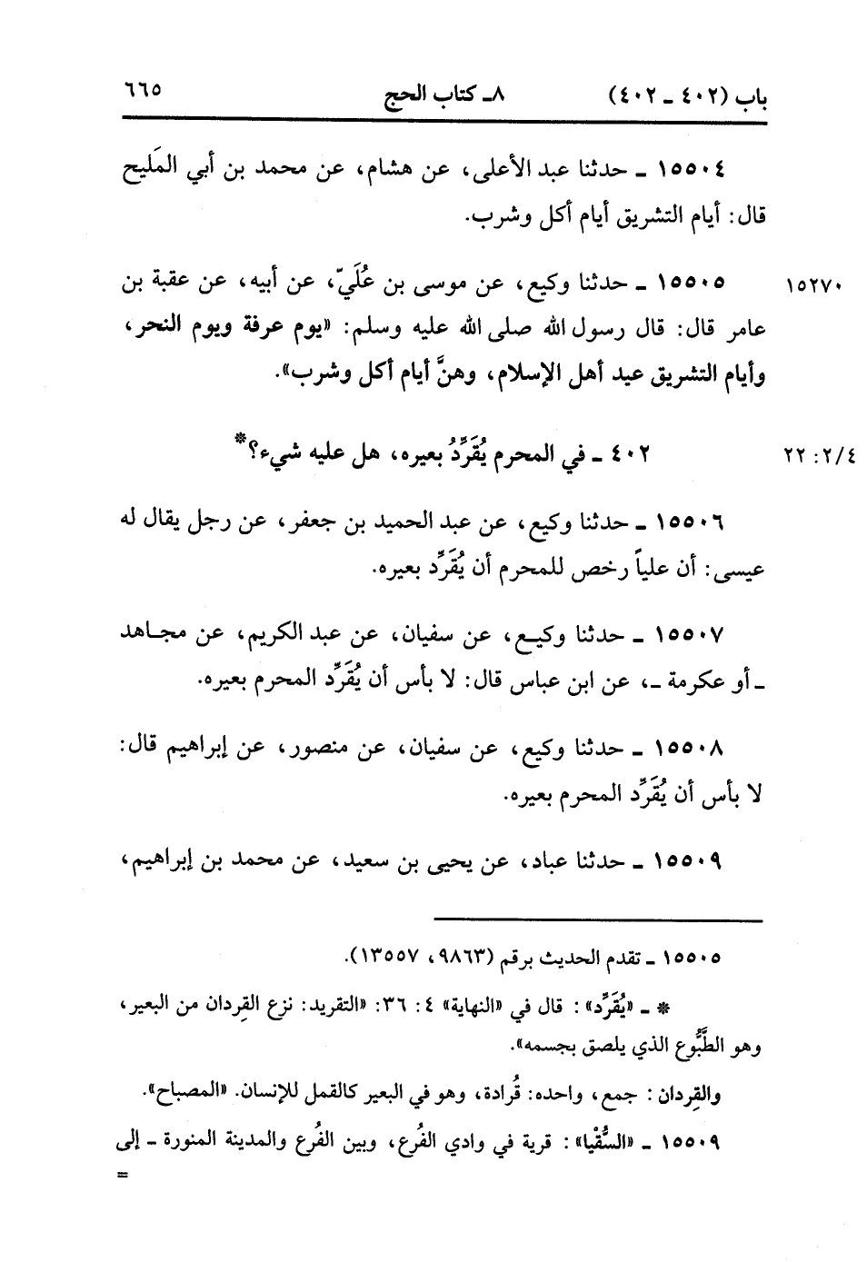 15508- حَدَّثَنَا وَكِيعٌ , عَنْ سُفْيَانَ , عَنْ مَنْصُورٍ , عَنْ إبْرَاهِيمَ ، قَالَ : لاَ بَأْسَ أَنْ يُقَرِّدَ الْمُحْرِمُ بَعِيرَهُ.