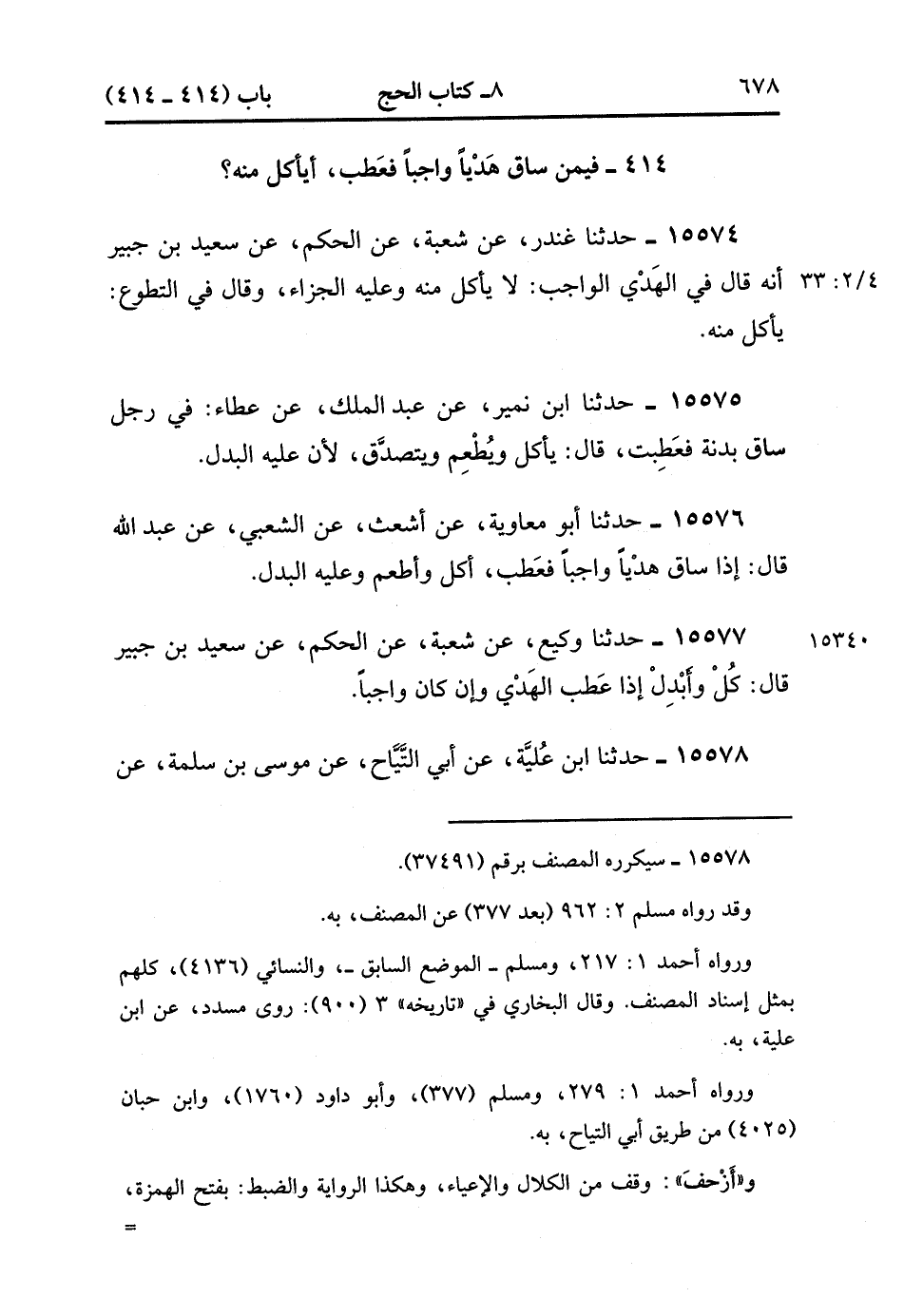 15574- حَدَّثَنَا غُنْدَرٌ , عَنْ شُعْبَةَ , عَنِ الْحَكَمِ , عَنْ سَعِيدِ بْنِ جُبَيْرٍ ، أَنَّهُ قَالَ فِي الْهَدْيِ الْوَاجِبِ : لاَ يَأْكُلُ مِنْهُ وَعَلَيْهِ الجَزَاء ، وَقَالَ فِي التَّطَوُّعِ : يَأْكُلُ مِنْهُ. (4/32:2)