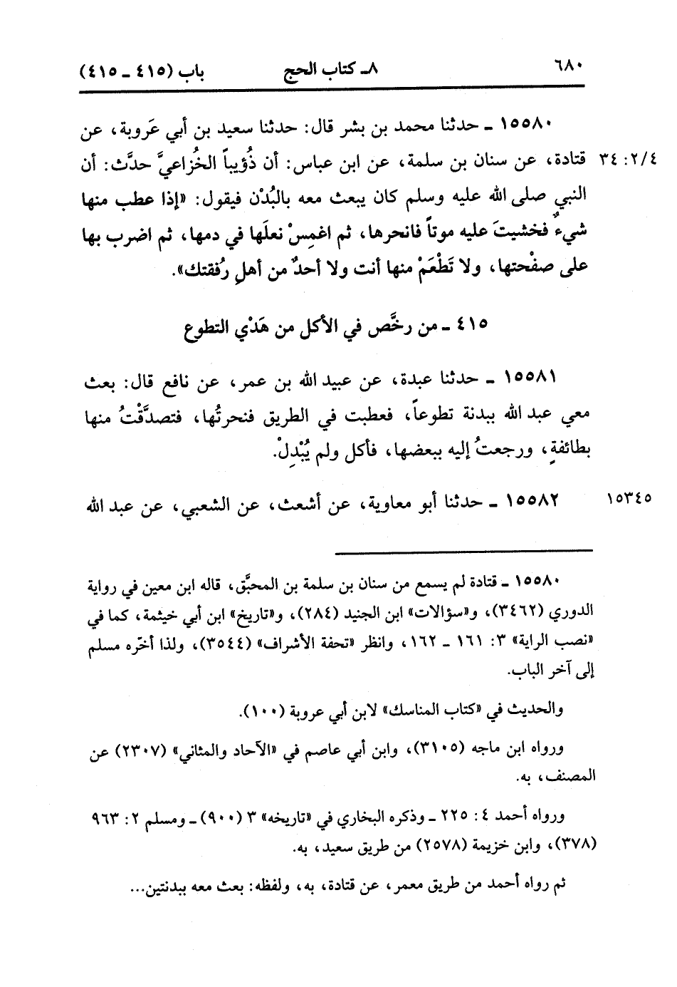 15580- حَدَّثَنَا مُحَمَّدُ بْنُ بِشرٍ , قَالَ : حدَّثَنَا سَعِيدُ بْنُ أَبِي عَرُوبَةَ , عَنْ قَتَادَةَ , عَنْ سِنَانٍ بن سَلَمَةَ , عَنِ ابْنِ عَبَّاسٍ ، أَنَّ ذُؤَيْبَ الْخُزَاعِيَّ حَدَّثَ ، أَنَّ النَّبِيَّ صَلَّى الله عَلَيْهِ وَسَلَّمَ كَانَ يَبْعَثُ مَعَهُ بِالْبُدْنِ ، فَيَقُولُ : إذَا عَطِبَ مِنْهَا شَيْءٌ فَخَشِيت عَلَيْهِ مَوْتًا فَانْحَرْهَا ، ثُمَّ اغْمِسْ نَعْلَهَا فِي دَمِهَا ، ثُمَّ اضْرِبْ بِهَا عَلَى صَفْحَتِهَا ، وَلاَ تُطْعِمْ مِنْهَا أَحَدٌ مِنْ أَهْلِ رُفْقَتِكَ. (4/33:2)